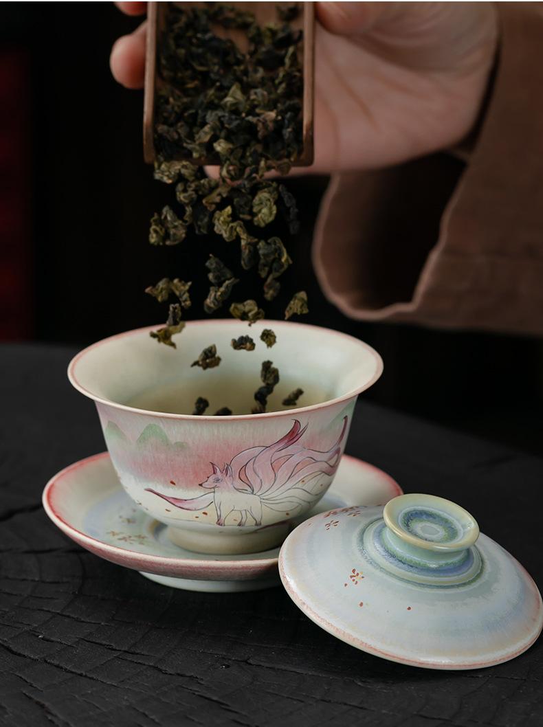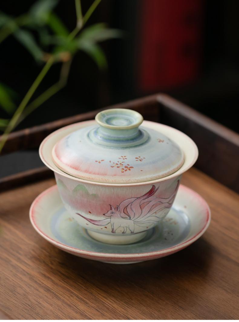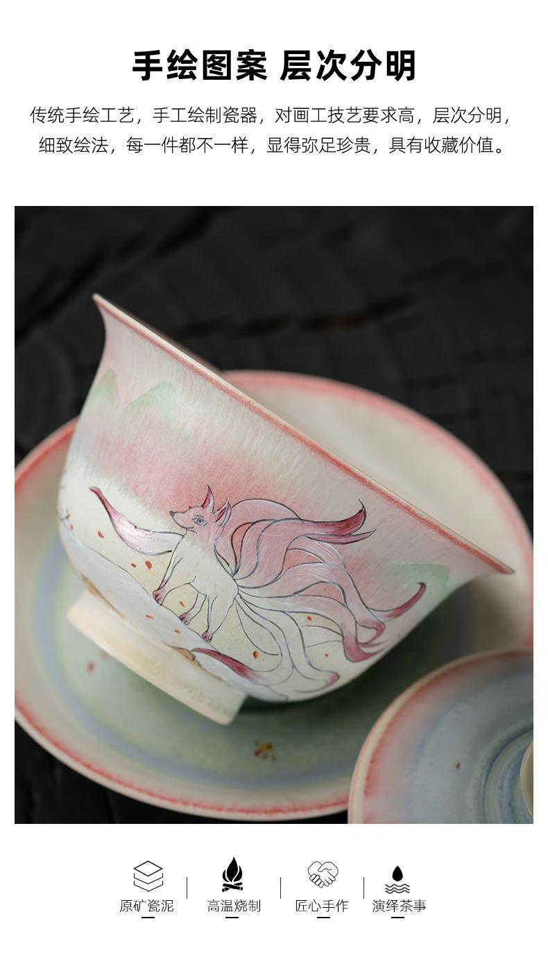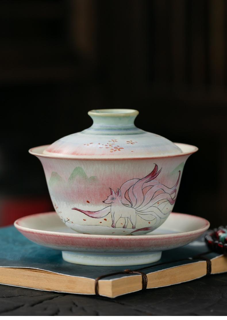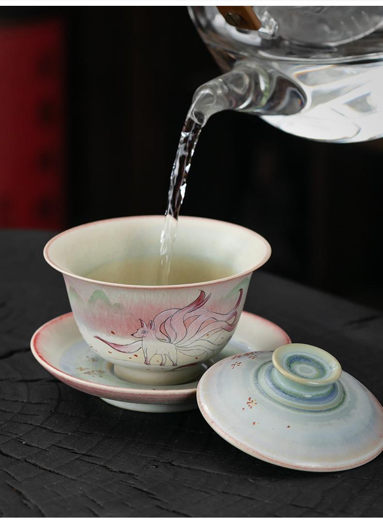 Tazón de té individual de alta gama Jingdezhen de ceniza de planta cocido a leña y pintado a mano al torno Zorro de nueve colas Taza de té voladora Tazón cubierto Sancai