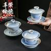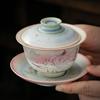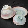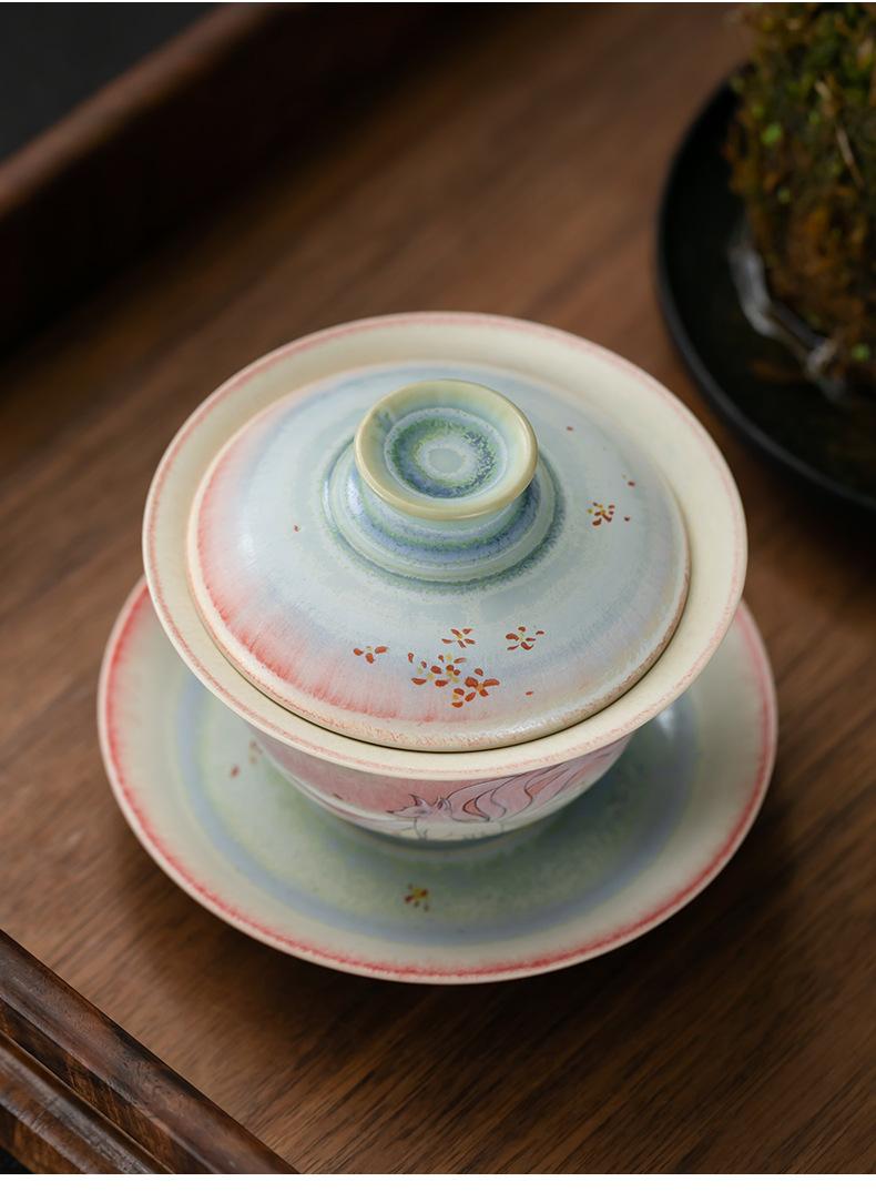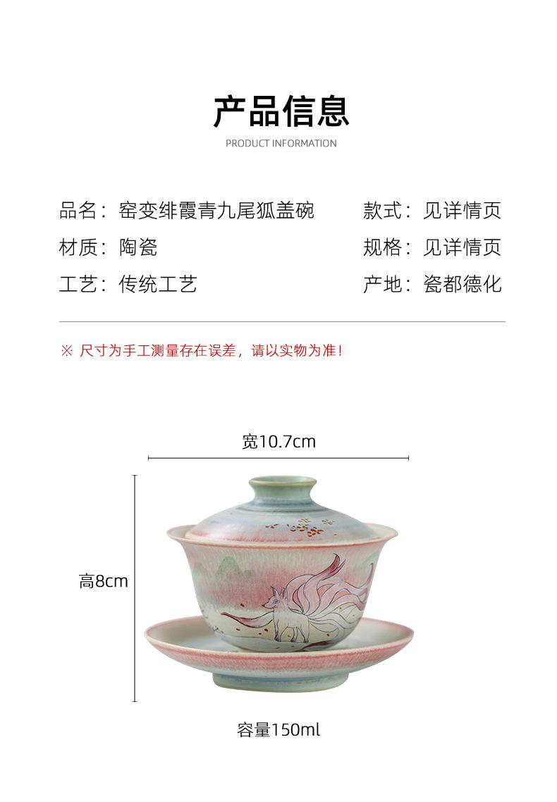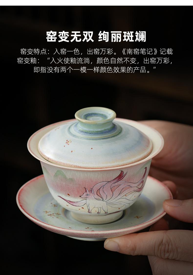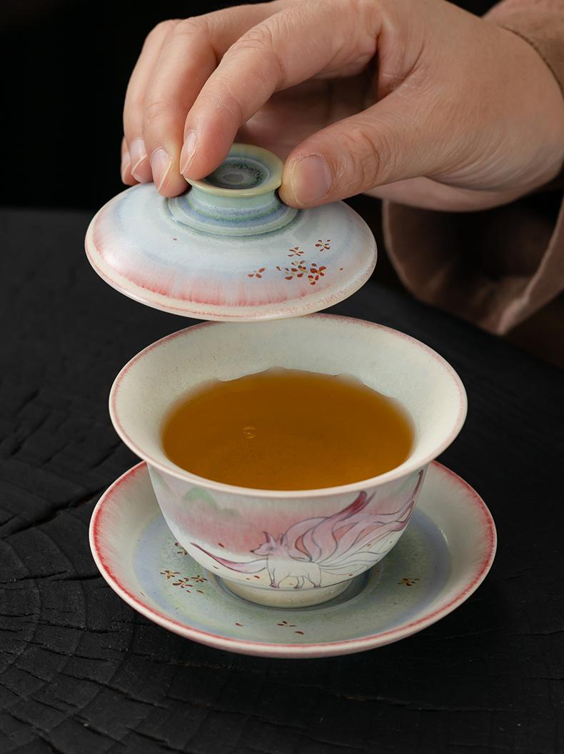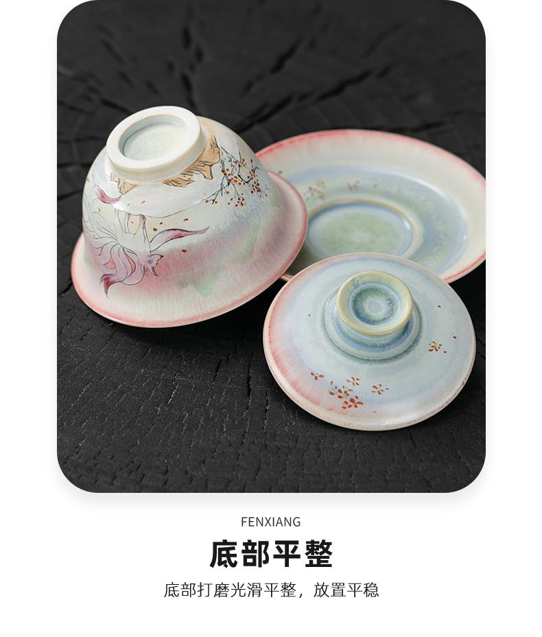 Tazón de té individual de alta gama Jingdezhen de ceniza de planta cocido a leña y pintado a mano al torno Zorro de nueve colas Taza de té voladora Tazón cubierto Sancai