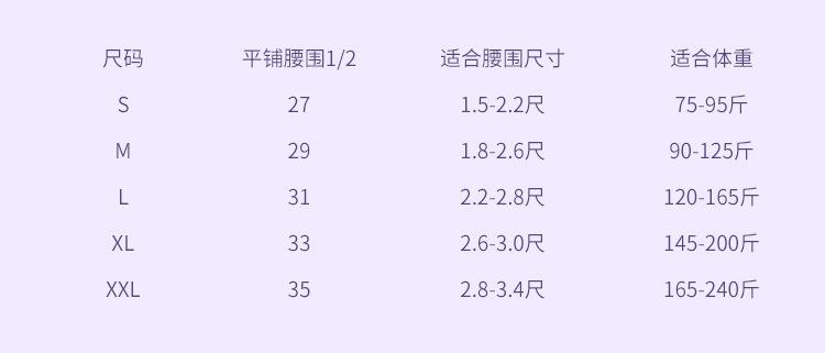 | Código S | 27 cm | 1.5-2.2 pies | 75-95 libras | Tejido: 90% nailon, 10% elastano. Forro (entrepierna): 100% algodón | ||||||||