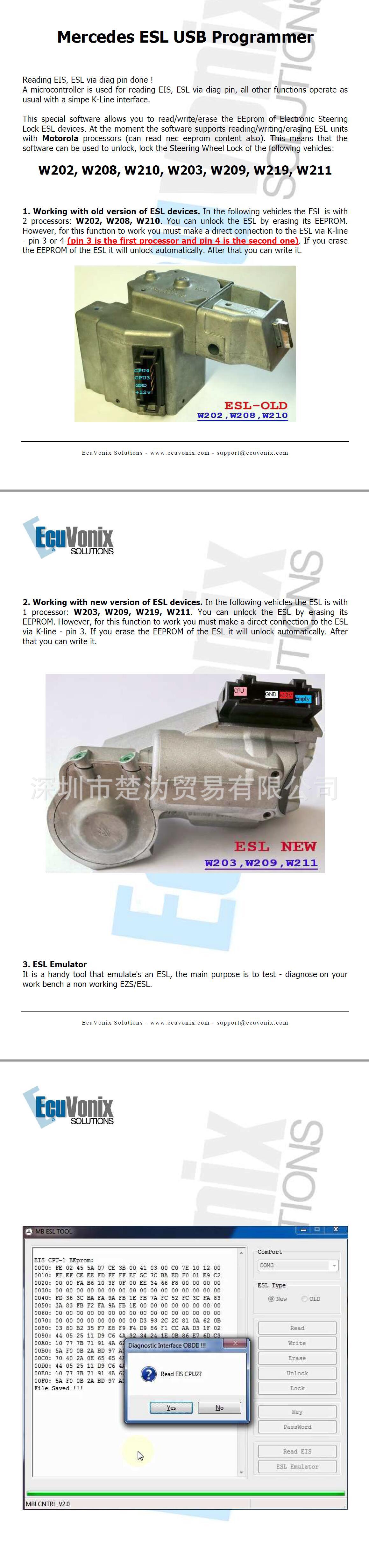 El dispositivo de lectura/escritura/borrado de EEPROM de bloqueo electrónico de dirección ESL de Mercedes-Benz admite los siguientes modelos de chasis de Mercedes-Benz: W202, W208, W210, W203, W209, W219, W211