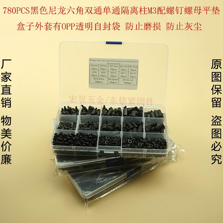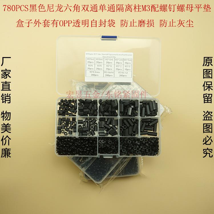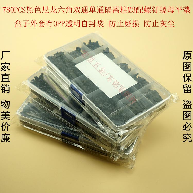 780 piezas M3 negro plástico nailon paso sencillo doble paso columna de aislamiento hexagonal con tornillos, tuercas y arandelas juego combinado