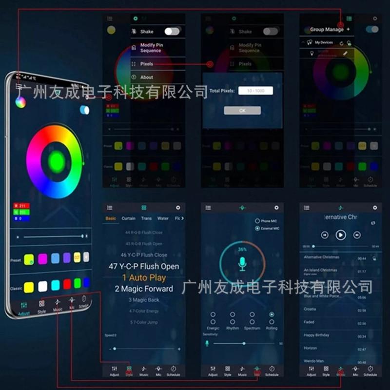 Introducción de la función: El software de la aplicación puede controlar colores de 1600 W y 210 modos dinámicos coloridos (divididos en ocho categorías: 1 básico, 2 de apertura y cierre, 3 de transición, 4 de agua corriente, 5 de flujo, 6 de seguimiento, 7 de avance, 8 de retroceso ), puede ajustar el modo de música del teléfono móvil, el micrófono interno, 8 modos de micrófono externo, puede ajustar el brillo (solo para monocromo), puede ajustar la velocidad (solo para el modo dinámico colorido), puede ajustar la sensibilidad (solo para micrófonos internos y externos), puede configurar interruptores, luces de temporizador, etc. (solo cuando está encendido)