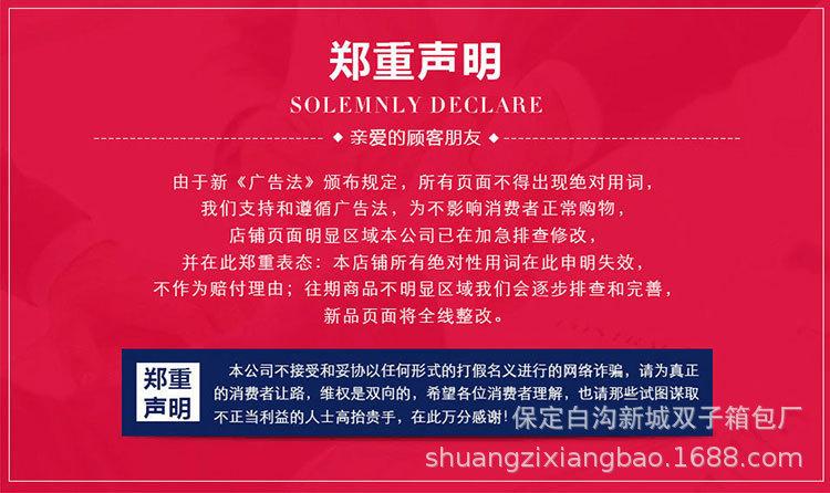 Shuangzi Luggage Factory es una empresa de producción integral que integra diseño, investigación y desarrollo, producción, ventas y procesamiento. La empresa cuenta con un departamento de marketing dedicado, un talentoso departamento de diseño, un departamento de producción a gran escala y un estricto departamento de inspección de calidad para garantizar que sus productos se produzcan sin problemas y sin complicaciones desde el diseño hasta el envío. Los productos principales son todo tipo de bolsos y carteras de mujer de moda y tendencia con estilos novedosos y estilos completos. Sus categorías de productos se subdividen en: bolsos para hombre, bolsos casuales para hombre, bolsos de moda para hombre, bolsos de comercio exterior para hombre, bolsos coreanos para hombre, bolsos de cuero artificial para hombre, bolsos de PU para hombre, bolsos de PVC para hombre, bolsos de hombro, mochilas, bolsos de mano, carteras, bolsos cruzados, bolsos casuales, bolsos para estudiantes, series de bolsos, bolsos para hombre, bolsos de cuero genuino, bolsos de cuero artificial, bolsos de PU, bolsos de PVC, bolsos de moda, bolsos de lona y otros productos. El estilo de diseño es único y vanguardista. Mediante el uso de colores naturales, los diseñadores integran orgánicamente elementos de moda, líneas suaves y un estilo informal. De esta manera, la combinación de moda y estilo de vida hace que sus productos sean excepcionales y destaquen. Además, diseñamos y producimos según sus necesidades (muestras y dibujos), además de ofrecerle procesamiento de artículos de cuero. El proceso de producción permite añadir diversos gráficos y textos a los productos, como marca, estampado en caliente, estampado en caliente plateado, serigrafía, bordado, etc. Con sus hermosas formas y exquisita artesanía, sus productos se venden con éxito en todo el país y se exportan a numerosos países y regiones como Hong Kong, Taiwán, el Sudeste Asiático, Europa y Estados Unidos. Twin Luggage Factory lidera las tendencias de moda e interpreta la vida con exquisitez. Capturamos con precisión la información sobre tendencias de moda, presentamos nuevos productos y servimos a nuestros clientes con productos y precios razonables. También ofrecemos diversos servicios de calidad, como venta al por mayor de bolsos, bolsos de mujer y lotes mixtos. Decididos a convertirnos en un proveedor de alta calidad en la industria de fabricación de artículos de cuero a nivel mundial. Como empresa en auge, nos adherimos al principio de "crear vida con corazón, crear riqueza con sabiduría y retribuir a la sociedad con amor". La innovación, la dedicación y el trabajo en equipo son nuestras tres principales fuentes de energía para un desarrollo constante y rápido. Esperamos buscar el desarrollo conjunto y oportunidades de negocio mutuamente beneficiosas con usted y nuestros amigos, tanto nacionales como internacionales. Nuestro principio de servicio eterno es: el cliente primero, la igualdad y el beneficio mutuo, la dedicación y el desarrollo conjunto. Le invitamos a contactarnos; le brindaremos productos excelentes y un servicio atento.