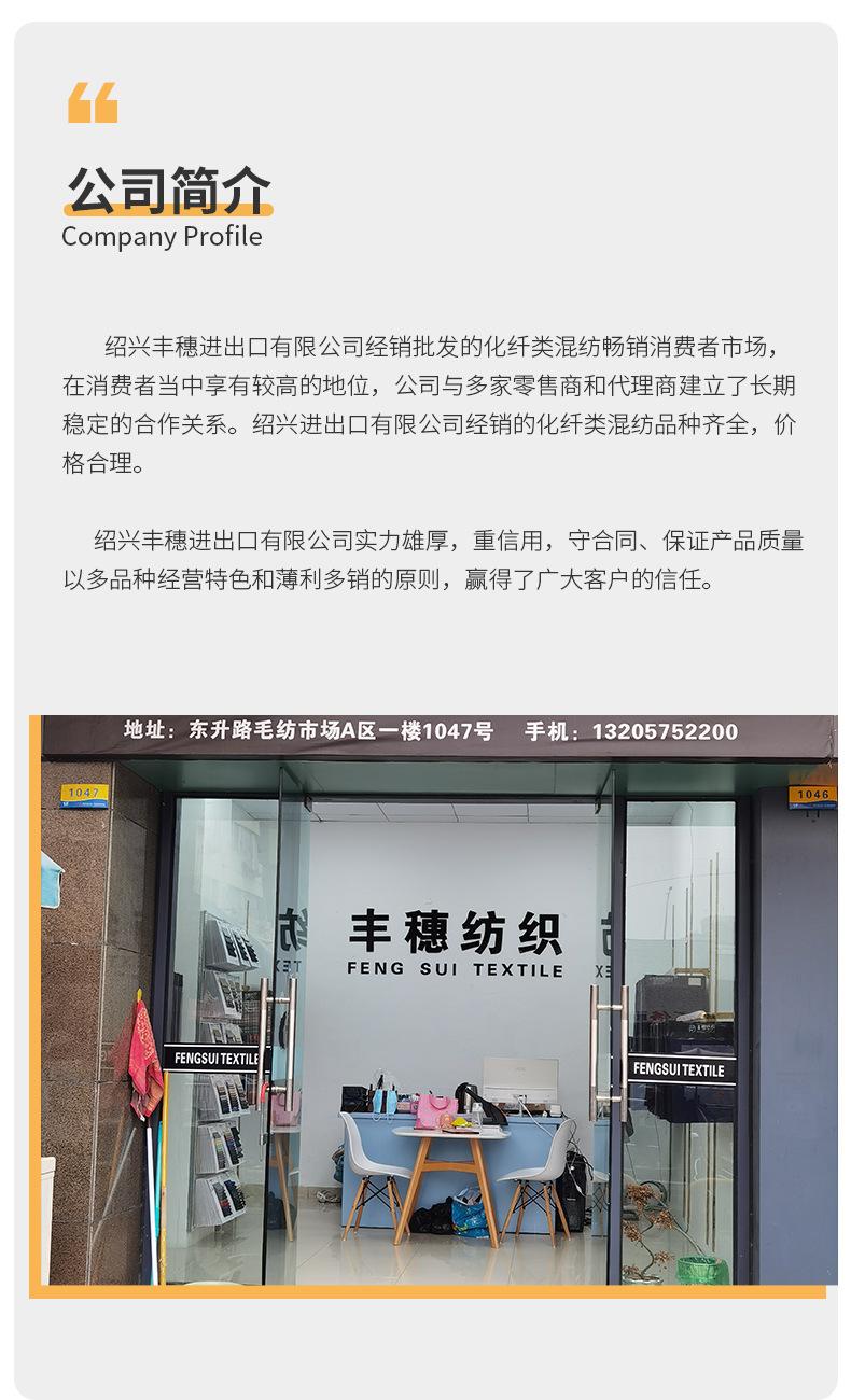 Shaoxing Fengsui Importación y Exportación Co., Ltd.Distribuidora y mayorista de diversos tipos de telas TR y telas para trajes de trabajo, la empresa es líder en el mercado de consumo y goza de gran prestigio entre los consumidores. Ha establecido relaciones de cooperación duraderas y estables con numerosos minoristas y agentes. Distribuye telas con una amplia gama de productos, precios razonables, gran solidez, respeta el crédito, cumple con los contratos y garantiza la calidad de sus productos. Se ha ganado la confianza de los clientes gracias a su amplia gama de productos y a su principio de bajos beneficios y rápida rotación.