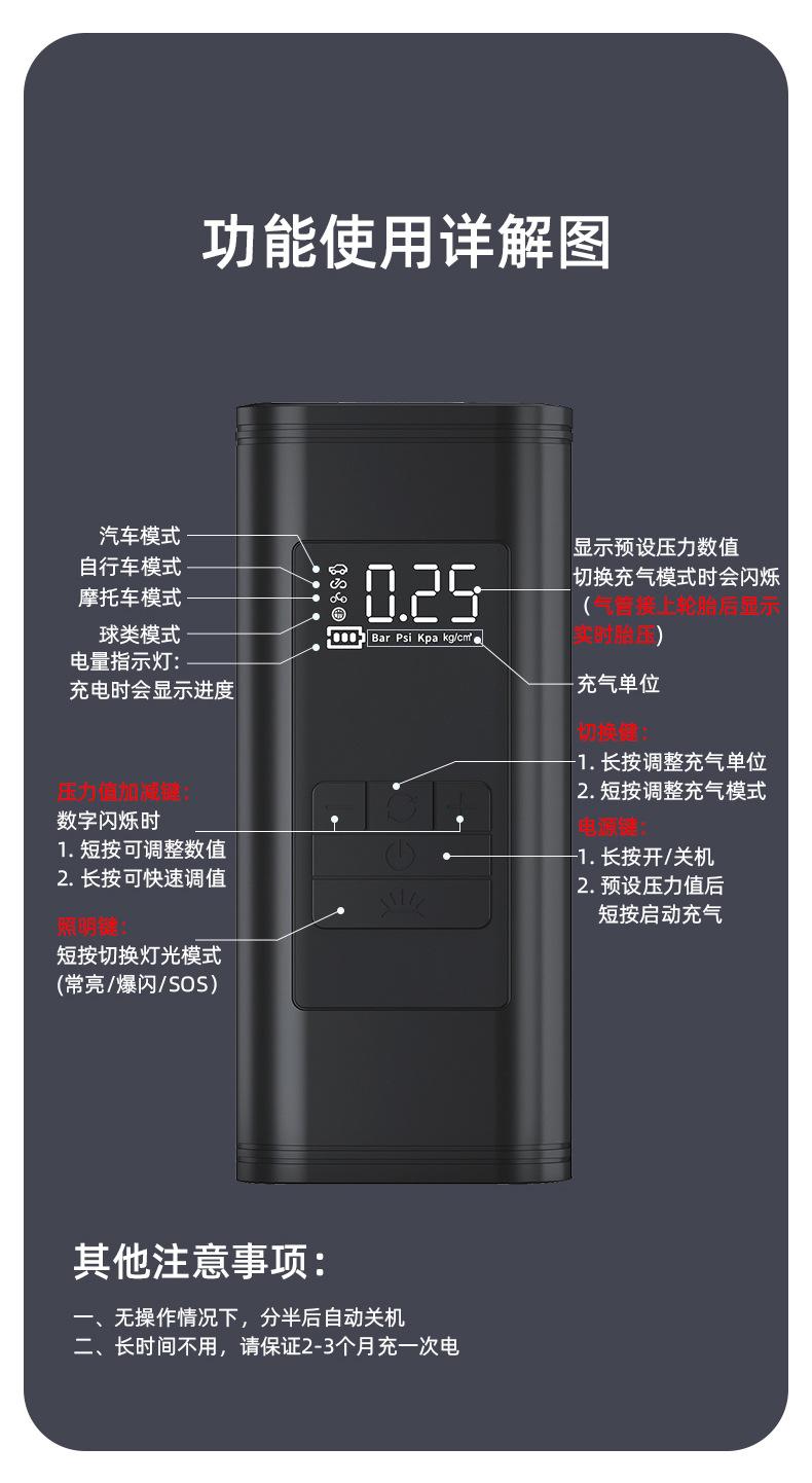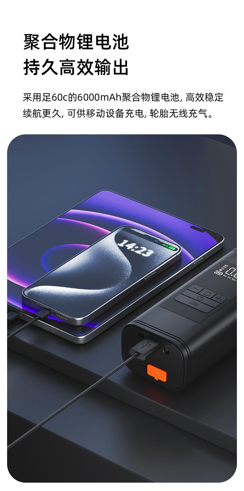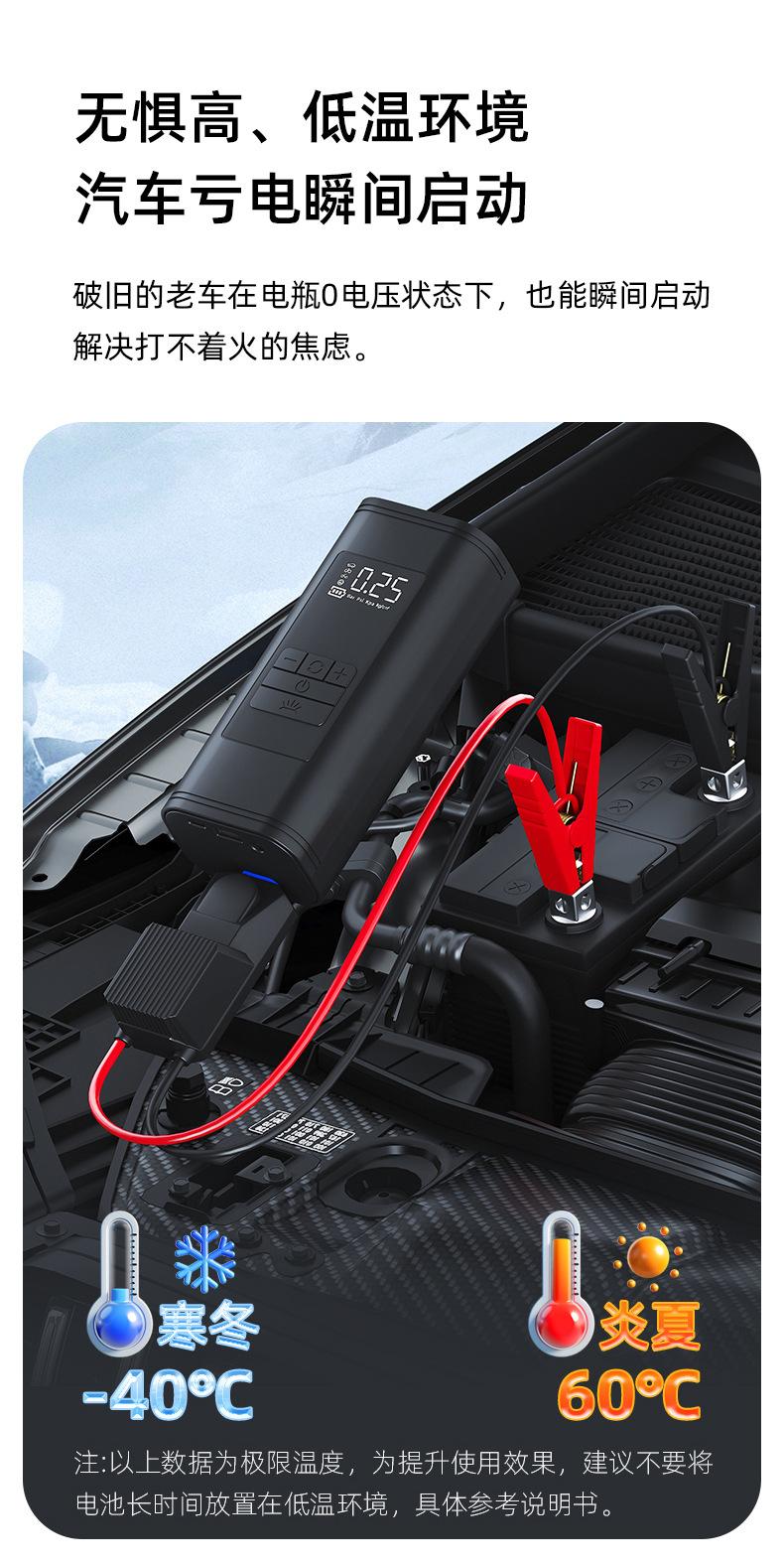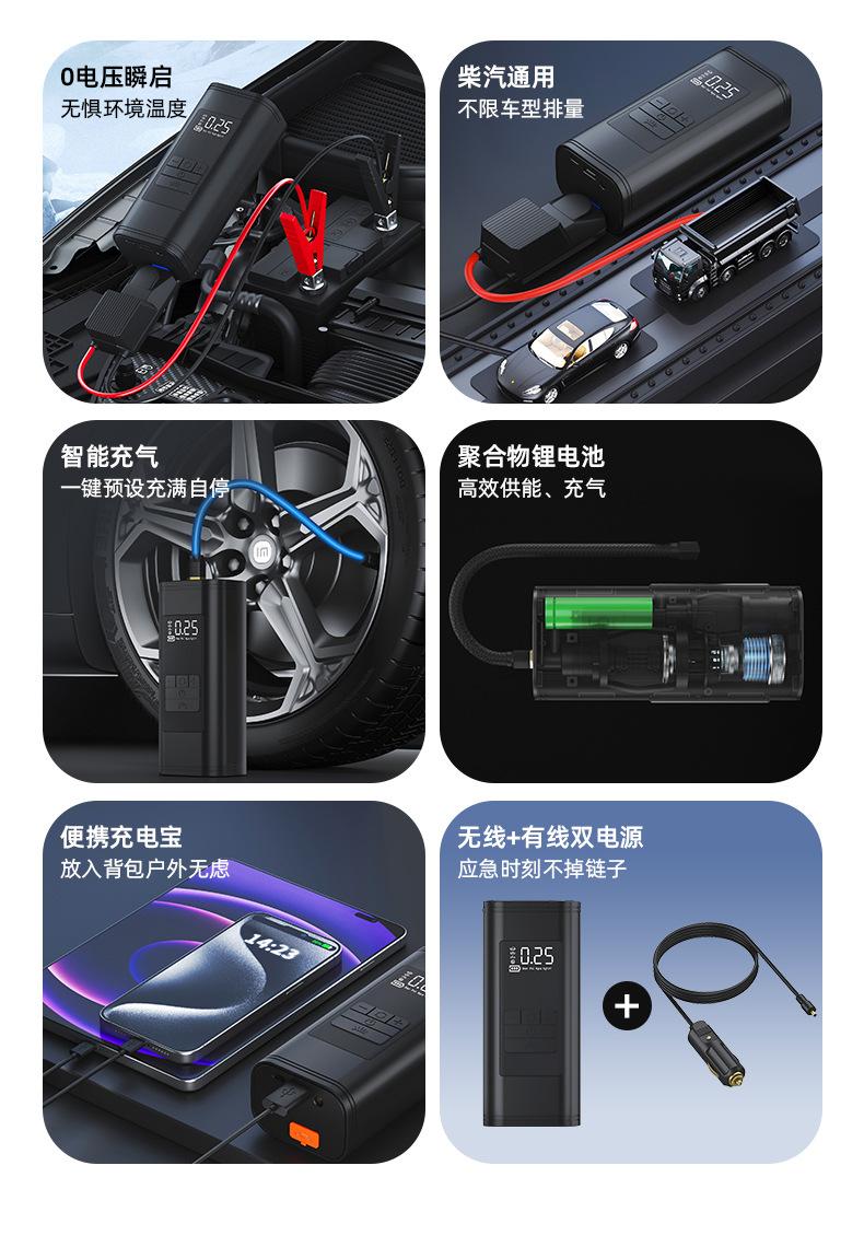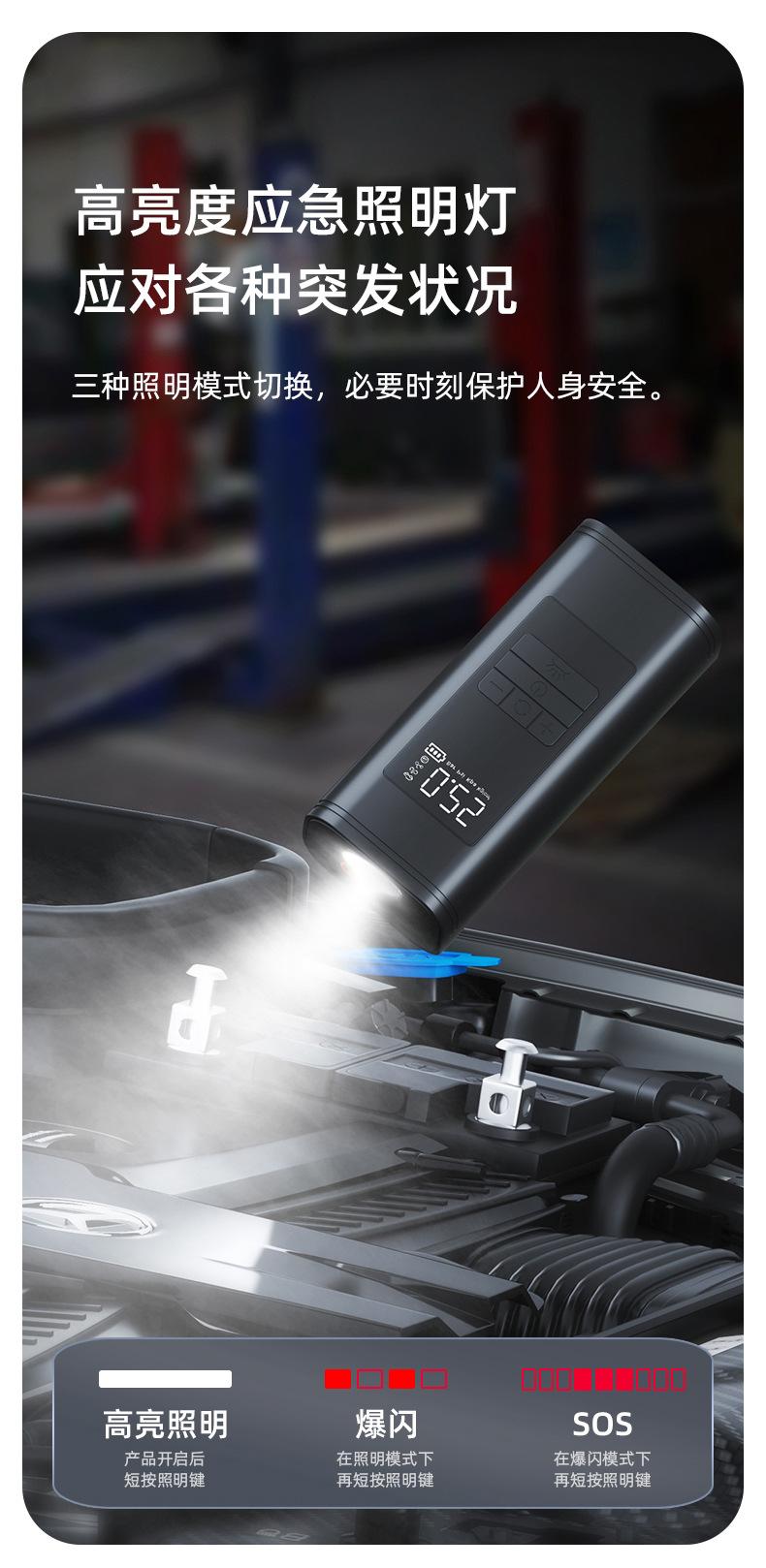 【Tres funciones principales】:Arrancador de emergencia, inflado inalámbrico+alámbrico, carga de dispositivos móviles, iluminación