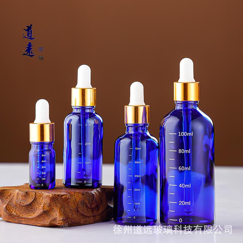 5ml+; blue scale bottle + gold ring + white plastic head + round head dropper; glass