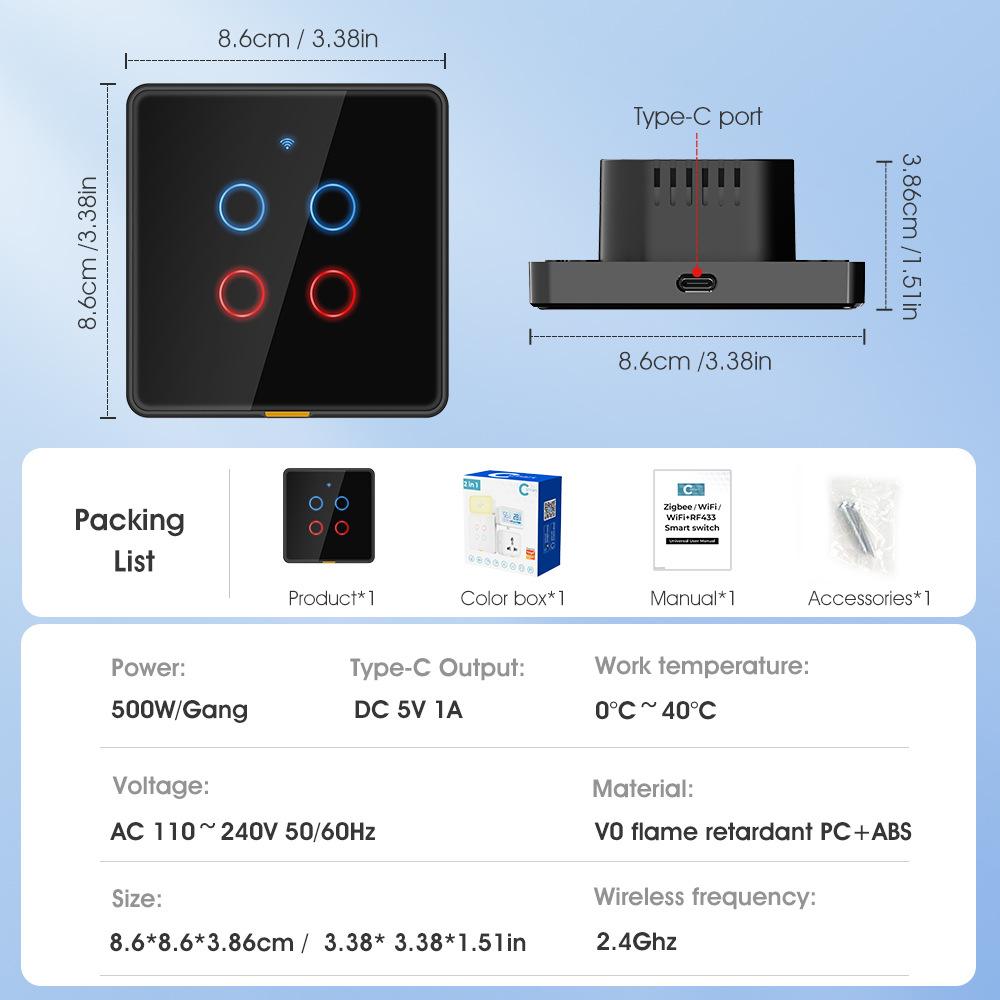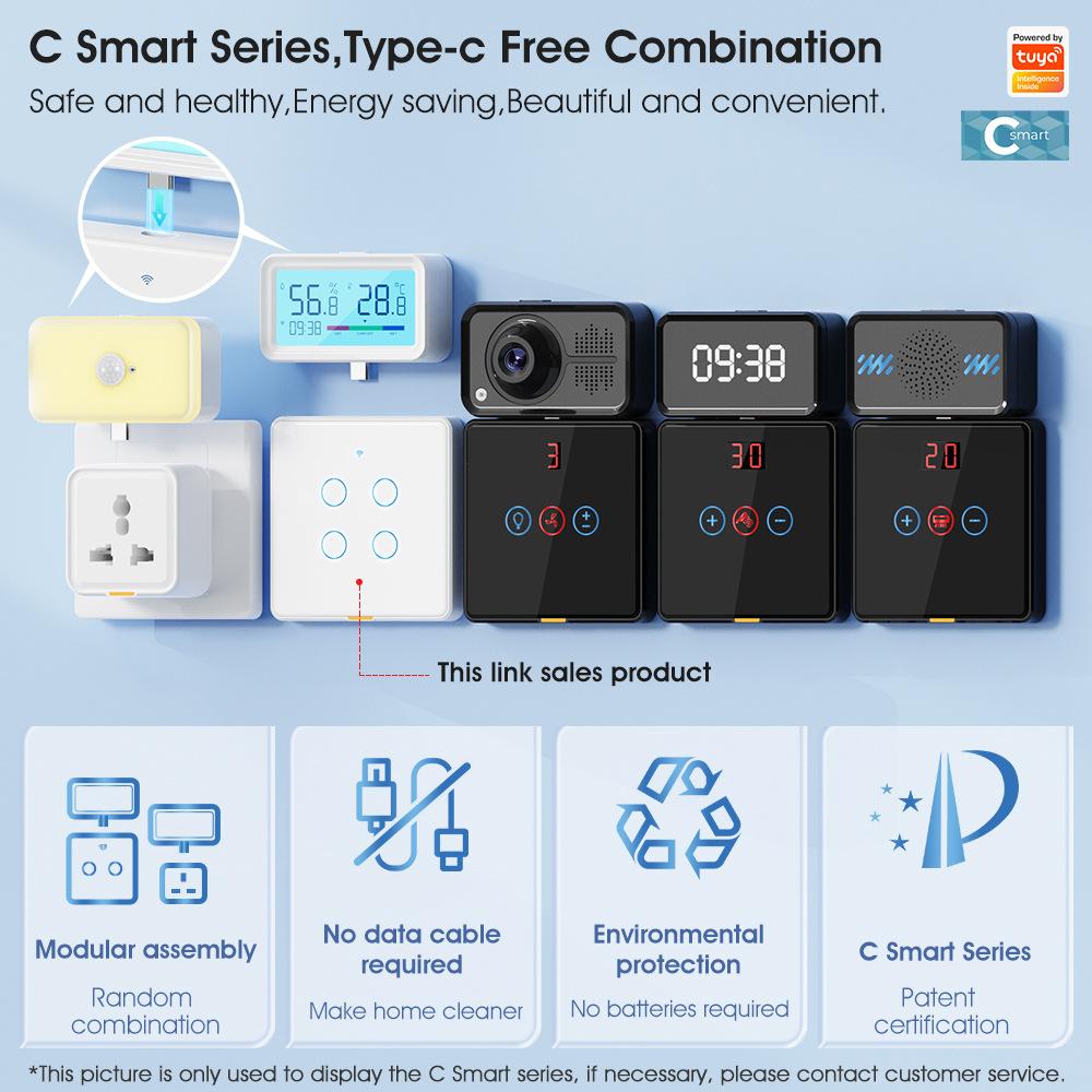 El diseño de interfaz Tipo-C es un estándar de interfaz muy conveniente y flexible, plug and play. Para garantizar la belleza general del hogar, hemos diseñado un conjunto completo de productos inteligentes, incluyendo timbres inteligentes, luces nocturnas, interruptores, enchufes, temperatura y humedad, sensores de presencia, cámaras y otros sensores inteligentes de seguridad. Siempre y cuando los interruptores o enchufes antiguos del hogar se reemplacen con nuestra serie "C smart", la instalación de los accesorios será muy fácil. Se pueden instalar donde se necesiten. Los ancianos y los niños pueden instalarlos. Solo enchufar y desenchufar, y es fácil hacerlo.