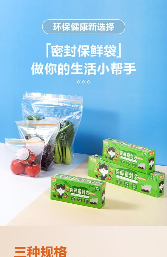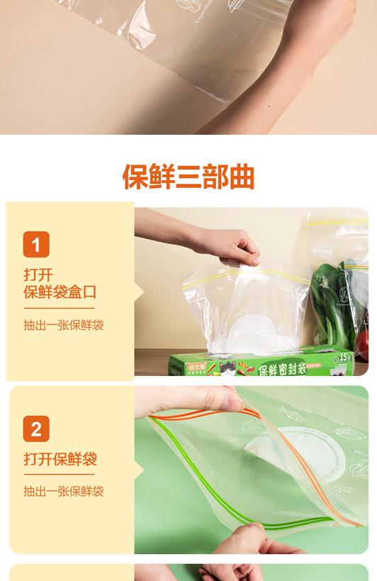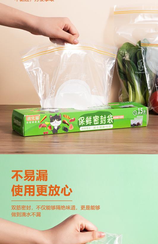 Bolsa de conservación de alimentos para refrigeradores domésticos, desechable, sellada, densiforme, con doble refuerzo y autosellante.