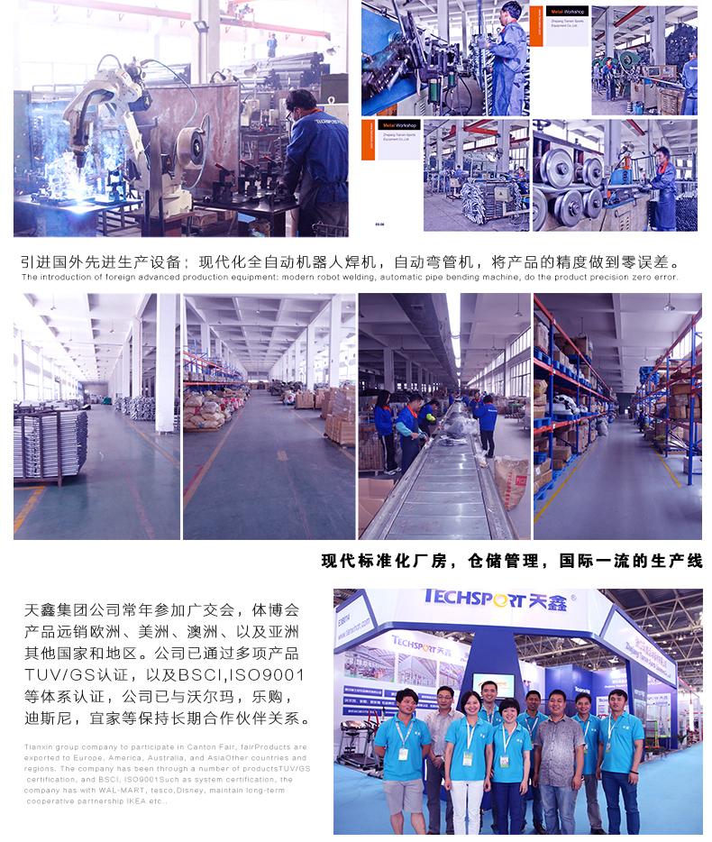 Zhejiang Tianxin Sports Equipment Co., Ltd. se estableció en 1984. Es una empresa de comercio exterior con series de fitness, deportes y ocio como sus productos principales, integrando I+D, diseño, producción y ventas.La empresa cubre un área de más de 60,000 metros cuadrados y cuenta con más de 1,000 empleados. Tiene avanzadas líneas de producción automatizadas, máquinas de soldadura robótica totalmente automáticas, equipos de pulverización totalmente automáticos y máquinas cortadoras de tubos totalmente automáticas, dobladoras de tubos y otros equipos desarrollados independientemente. También cuenta con múltiples juegos de equipos de prueba avanzados, con sólidas capacidades de I+D y producción, ahora tiene una capacidad de producción de 10,000 unidades por día. La empresa se ha ganado la confianza de nuestros clientes con su equipo profesional, diseño novedoso, excelente calidad, gestión estandarizada y servicio superior, y mantiene una asociación a largo plazo con la empresa.