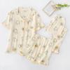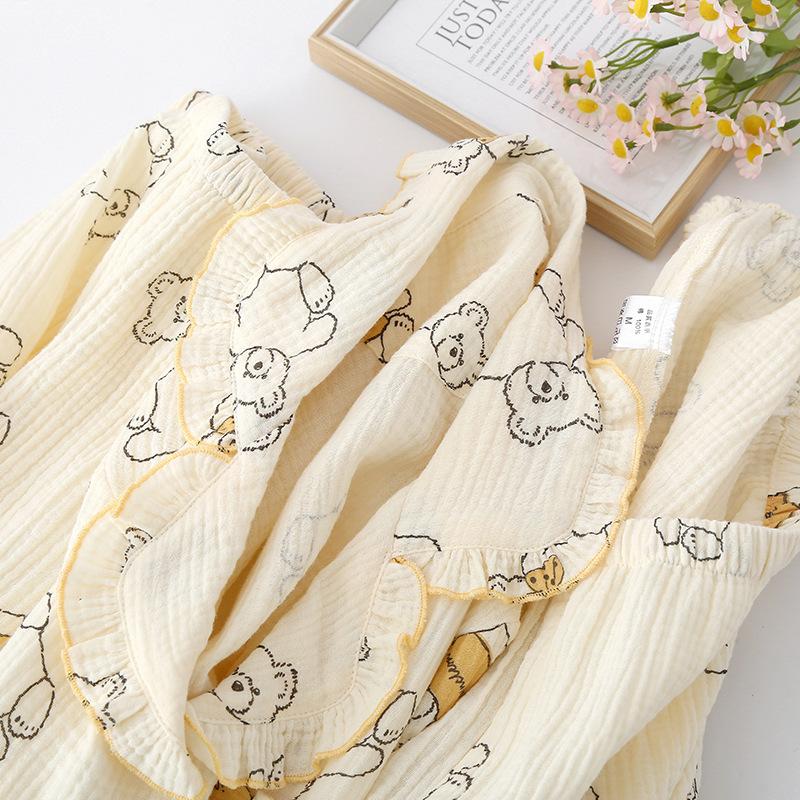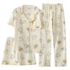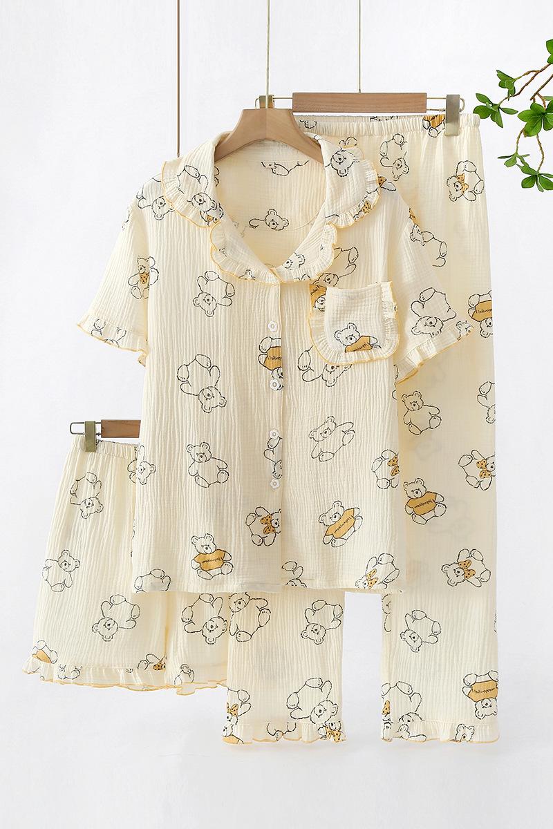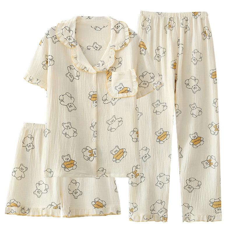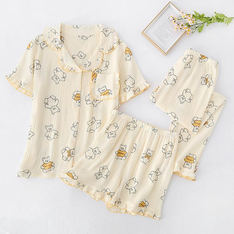 Pijama de Algodón Puro para Mujer Verano Delgado Manga Corta Pantalones Cortos Dulce Absorbente de Sudor Verano Otoño Tres Piezas Ropa para el Hogar