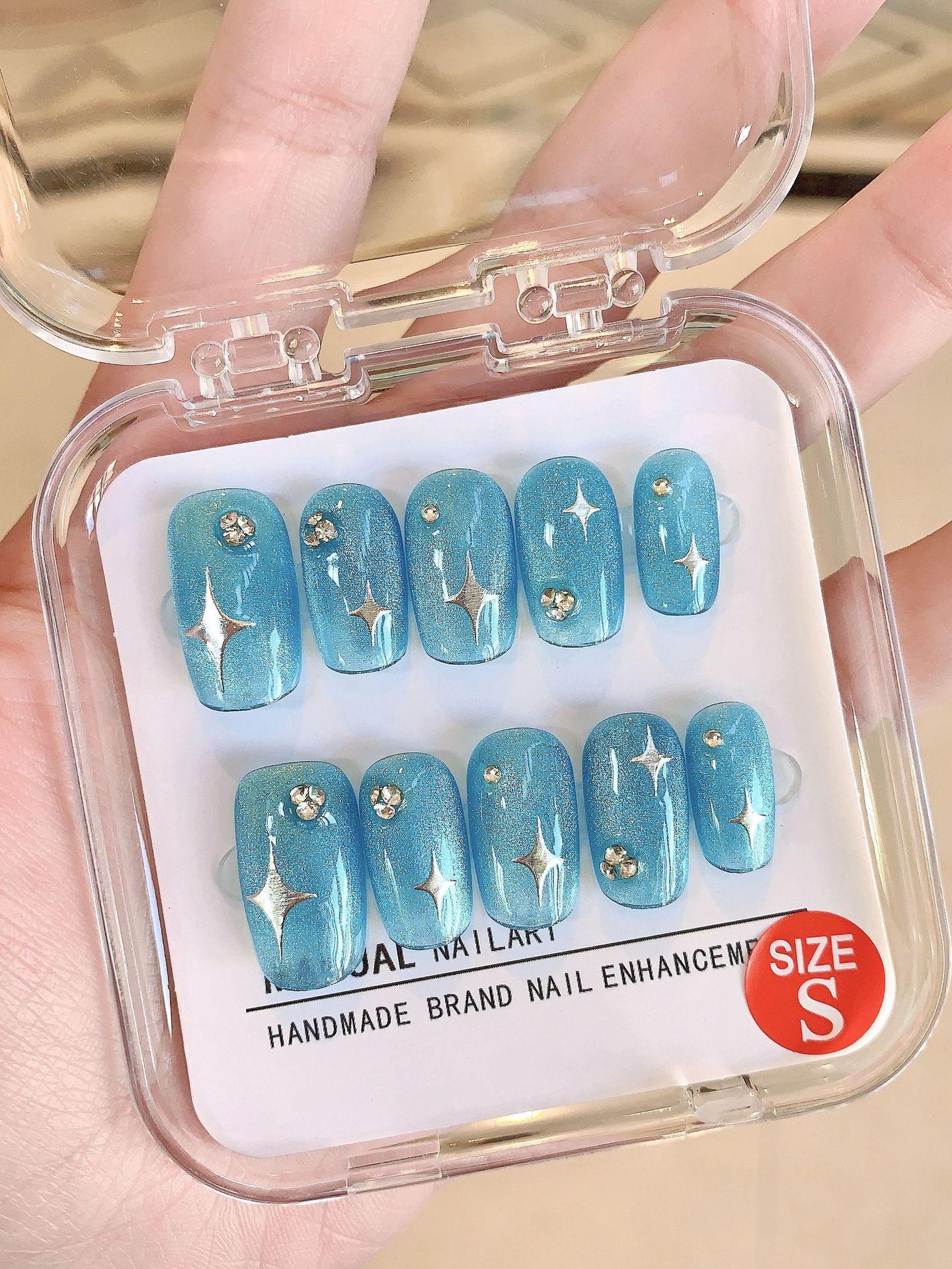[Foto real original] Parche para uñas hecho a mano con acabado de ojo de gato azul, estrella, destello, diamante, estilo puro deseo.