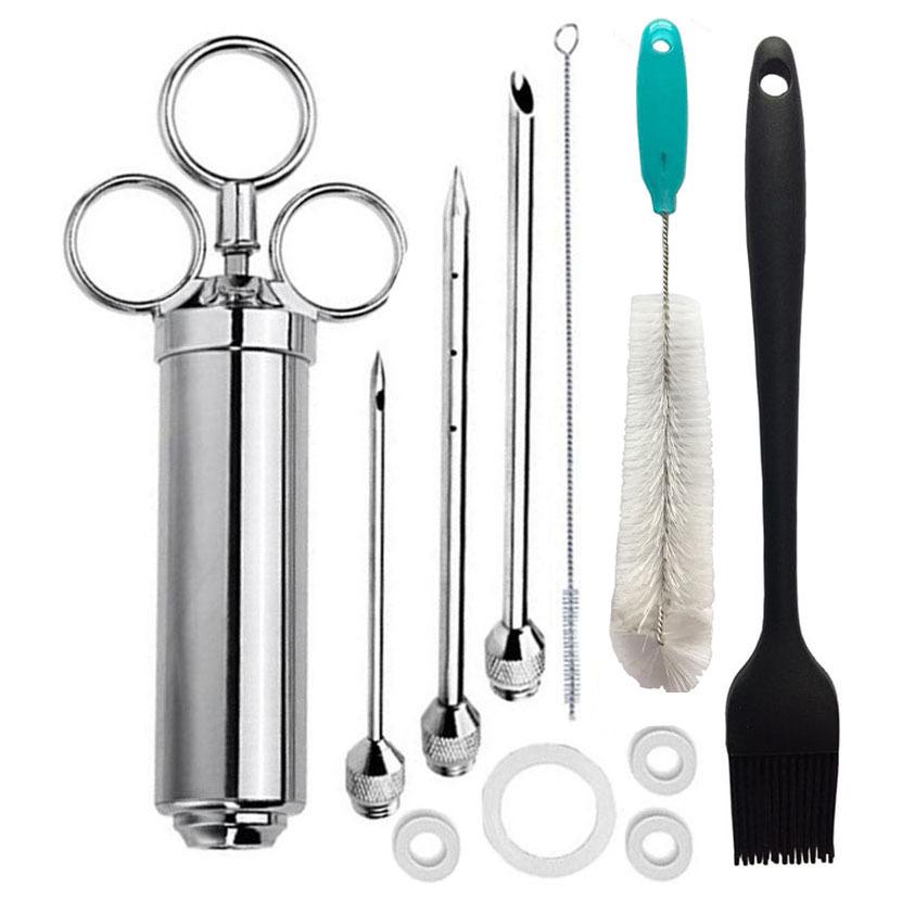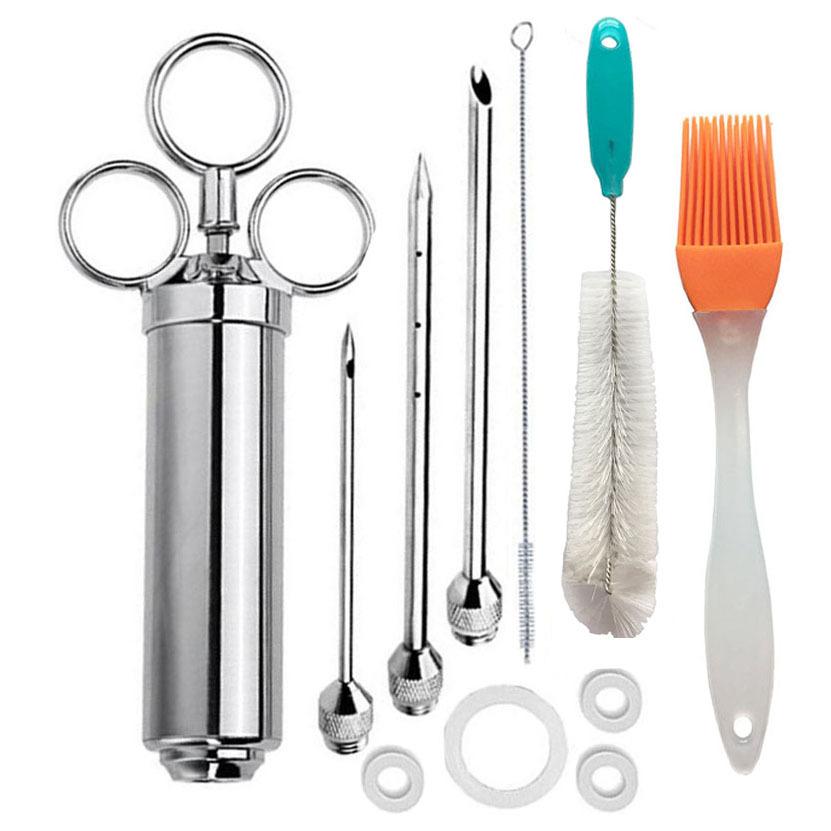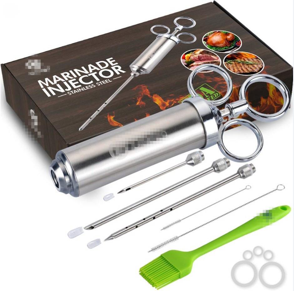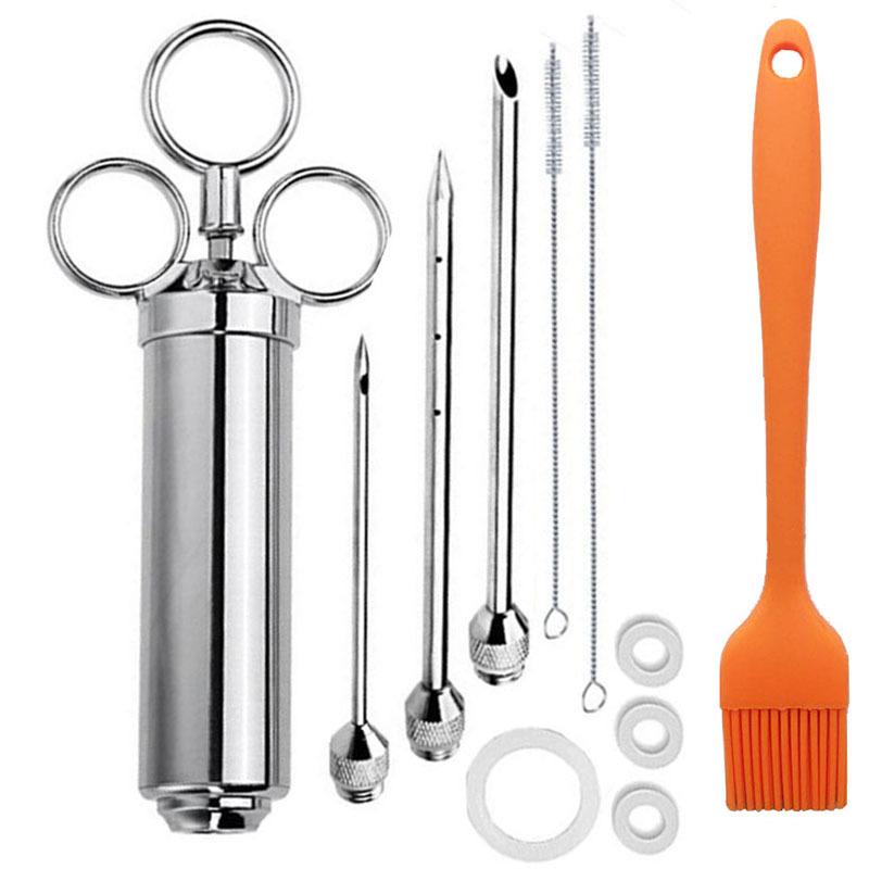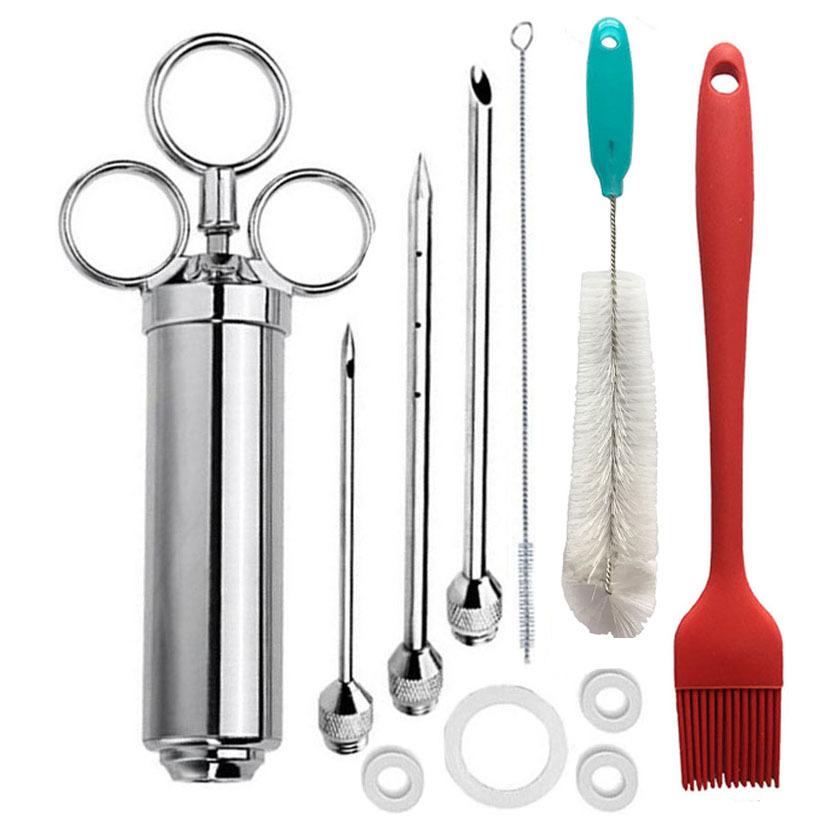 Cepillo de silicona con cepillo de limpieza. Jeringa de acero inoxidable de tres agujas para condimentos de filete de pavo. Aguja de pavo de 2 oz. Herramientas de cocina. Venta directa de fábrica. Taobao. Comercio exterior. Exportación. Amazon. Alibaba. AliExpress. Suministro.
