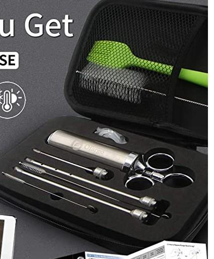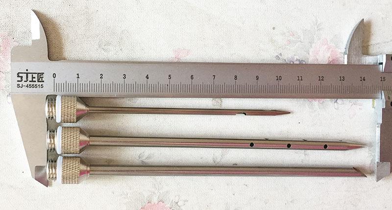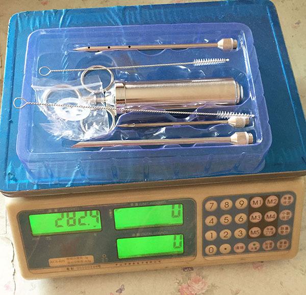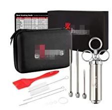 Este producto es una herramienta que se utiliza para inyectar condimentos en pavos o filetes. También se le llama aguja para pavo y está hecho de material de grado alimenticio. Su apariencia es regular.