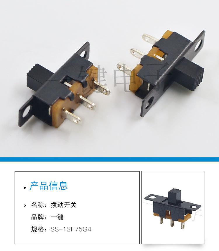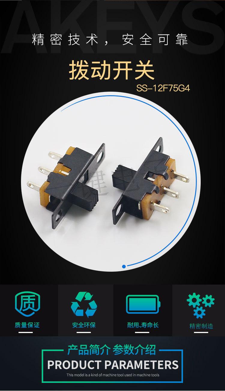 SS-12F75G4(1P2T) Interruptor de palanca vertical de una sola fila, 3 pines, 2 velocidades, longitud de manija: 4 mm, interruptor de encendido deslizante