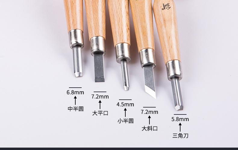 Juego de 5 cabezales de corte: boca plana grande, boca oblicua grande, semicírculo mediano, cuchilla triangular, semicírculo pequeño.