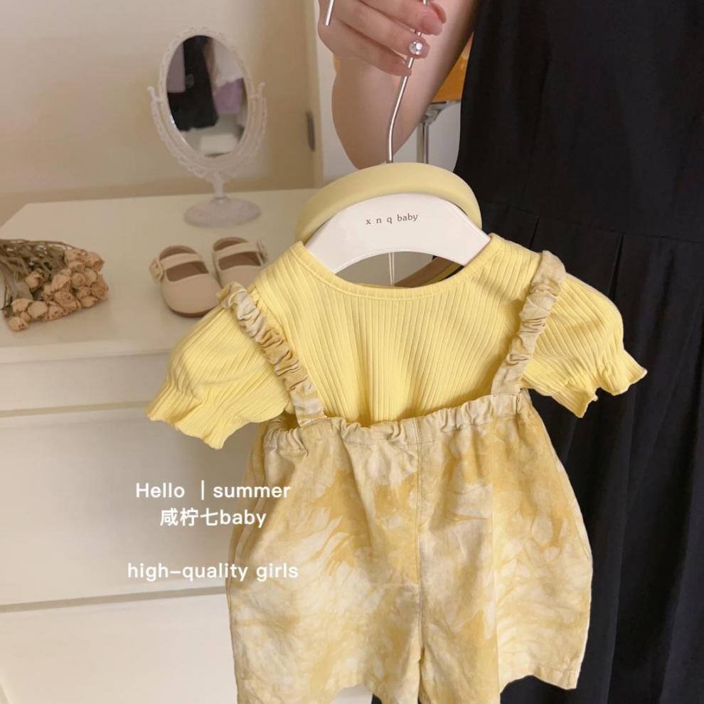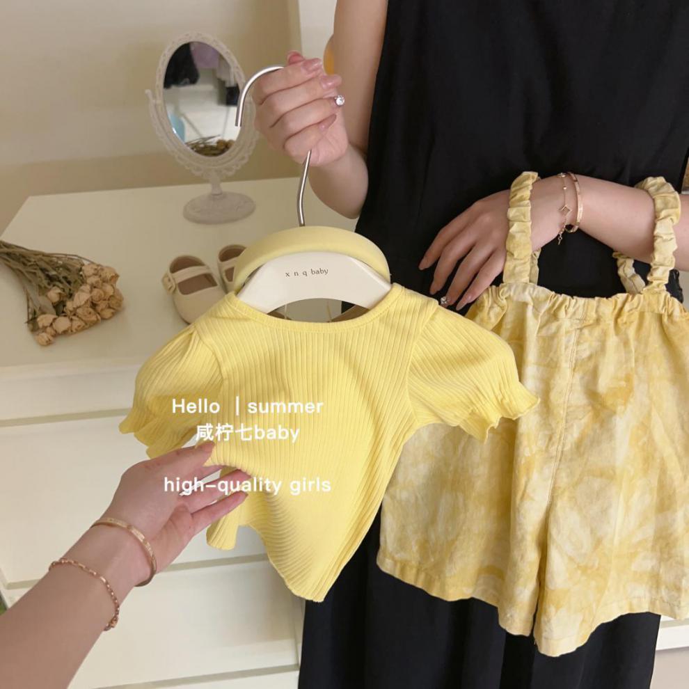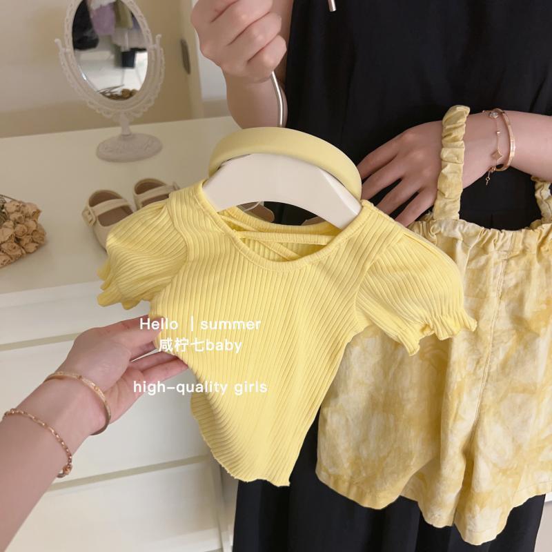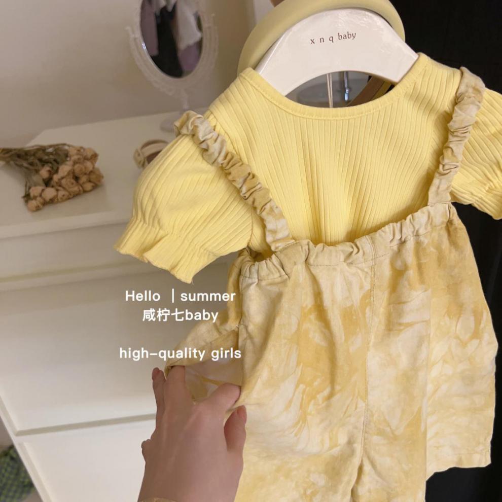 Traje de dos piezas de verano para niñas Bebé Elegante Personalidad Infantil Marca de Moda Coreano Canalé Rayado Camiseta Manga Burbuja Pantalones de Tirantes