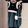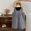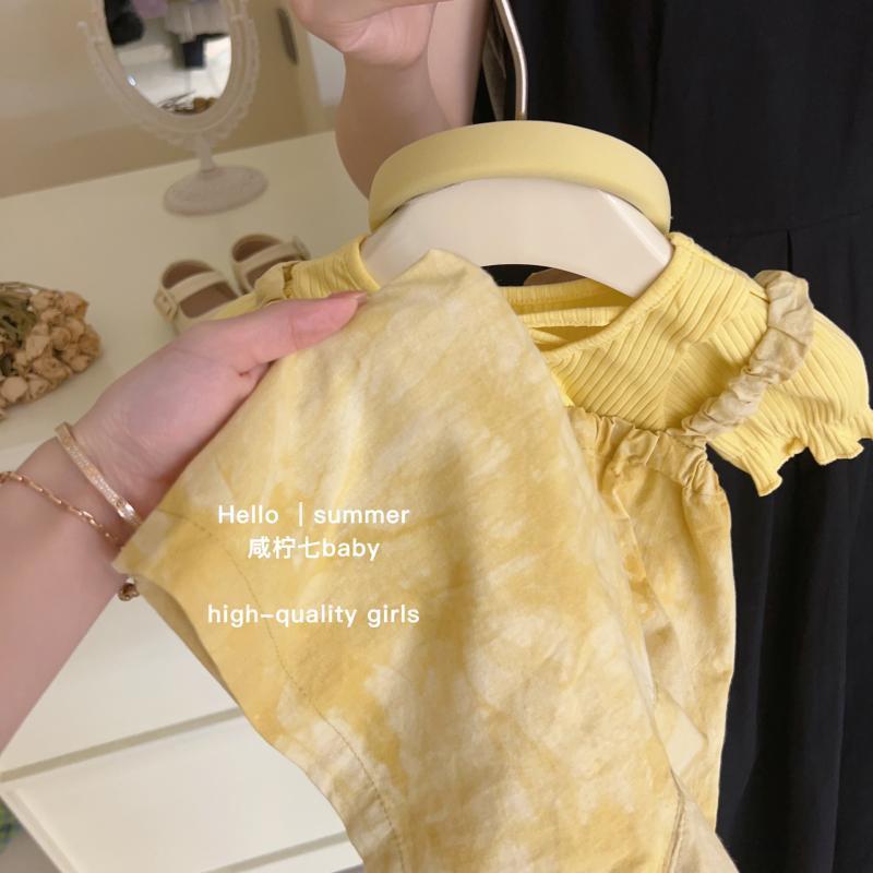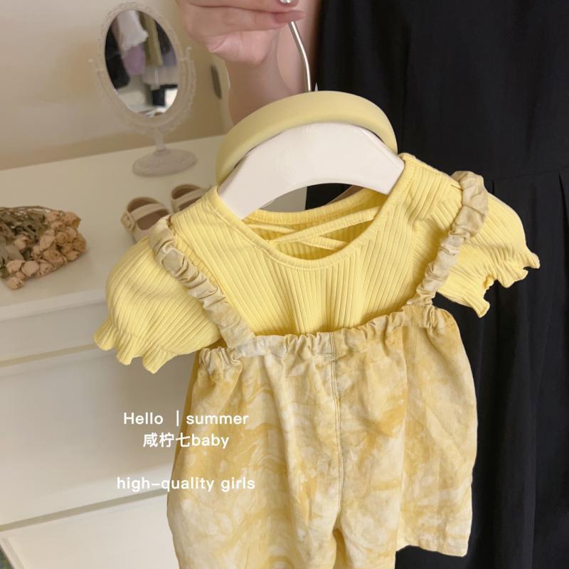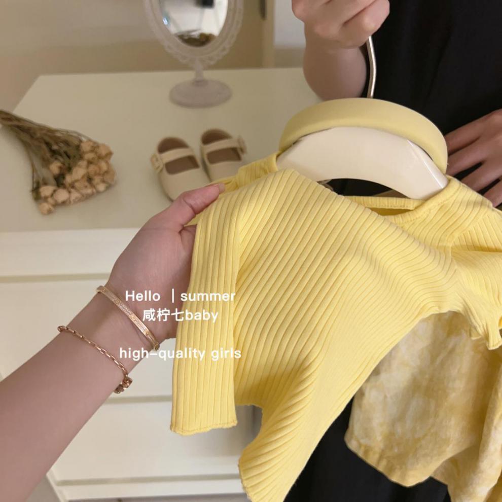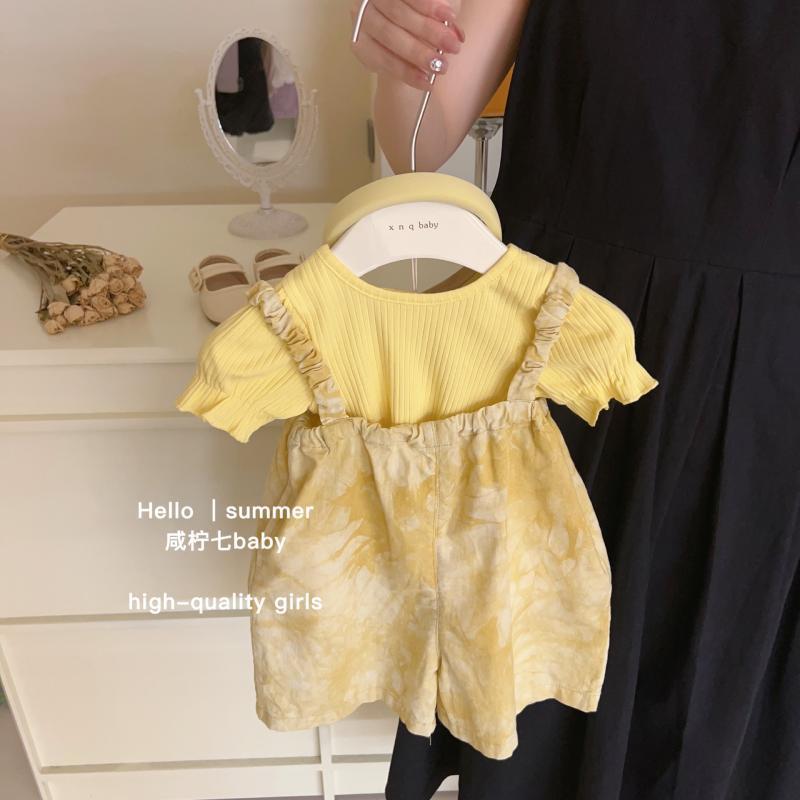 Traje de dos piezas de verano para niñas Bebé Elegante Personalidad Infantil Marca de Moda Coreano Canalé Rayado Camiseta Manga Burbuja Pantalones de Tirantes
