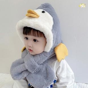 Sombrero de pingüino de otoño e invierno para bebés y niños, bufanda integrada de terciopelo grueso, sombrero para niños y niñas para mantener el calor y proteger las orejas