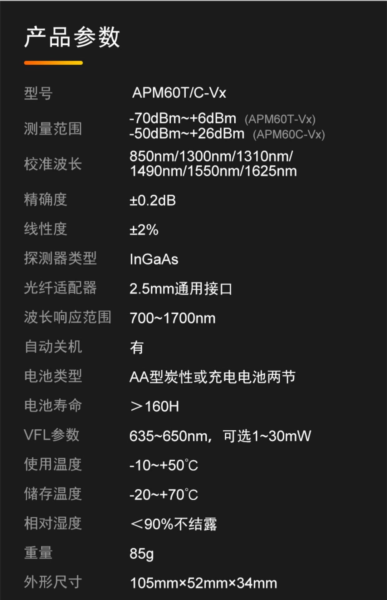 APM60T (single power meter without red light), APM60T-V01 (with 1mW red light), APM60T-V10 (with 1mW red light)