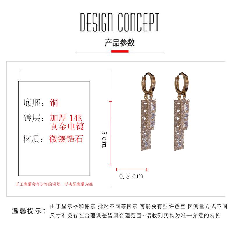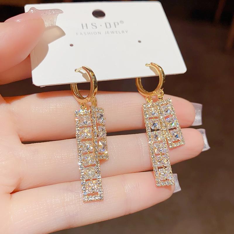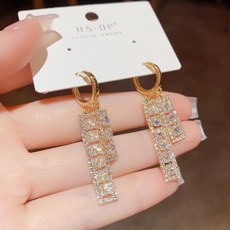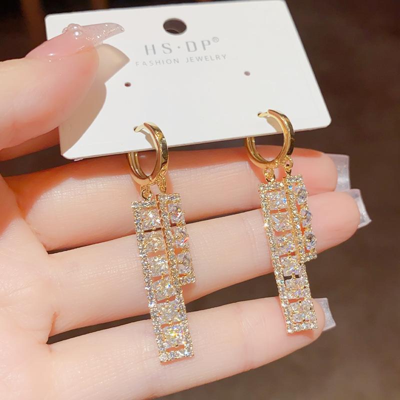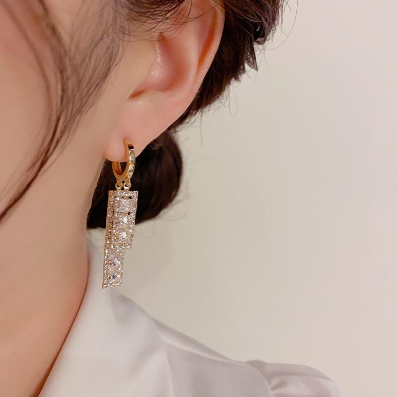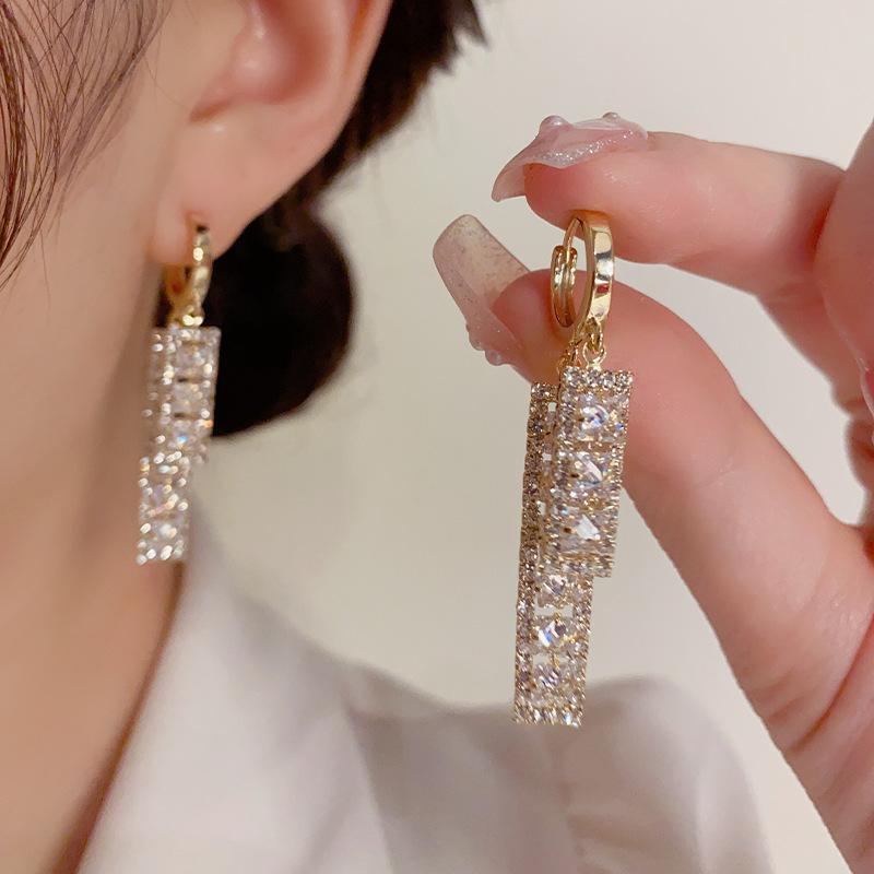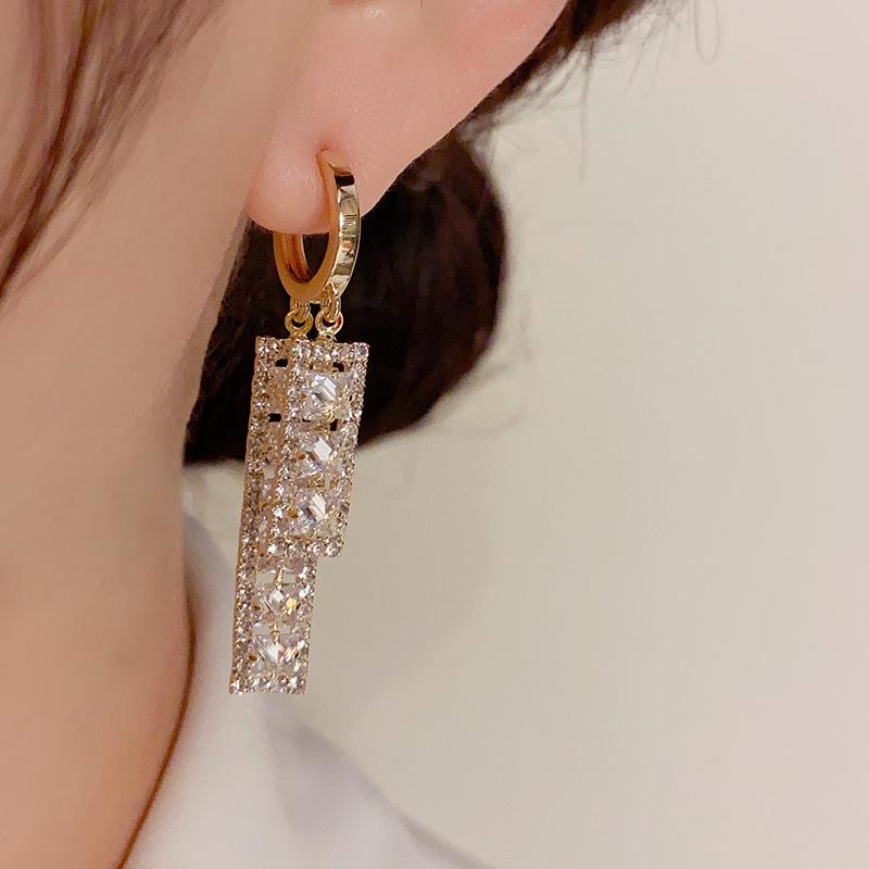 Temperamento de lujo ligero geométrico rectangular borla de circonita hebilla de oreja diseño nicho aretes exquisitos de alta gama Joker al por mayor