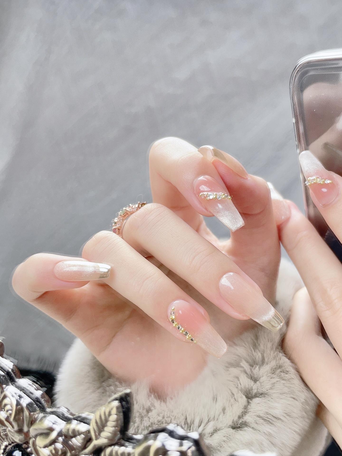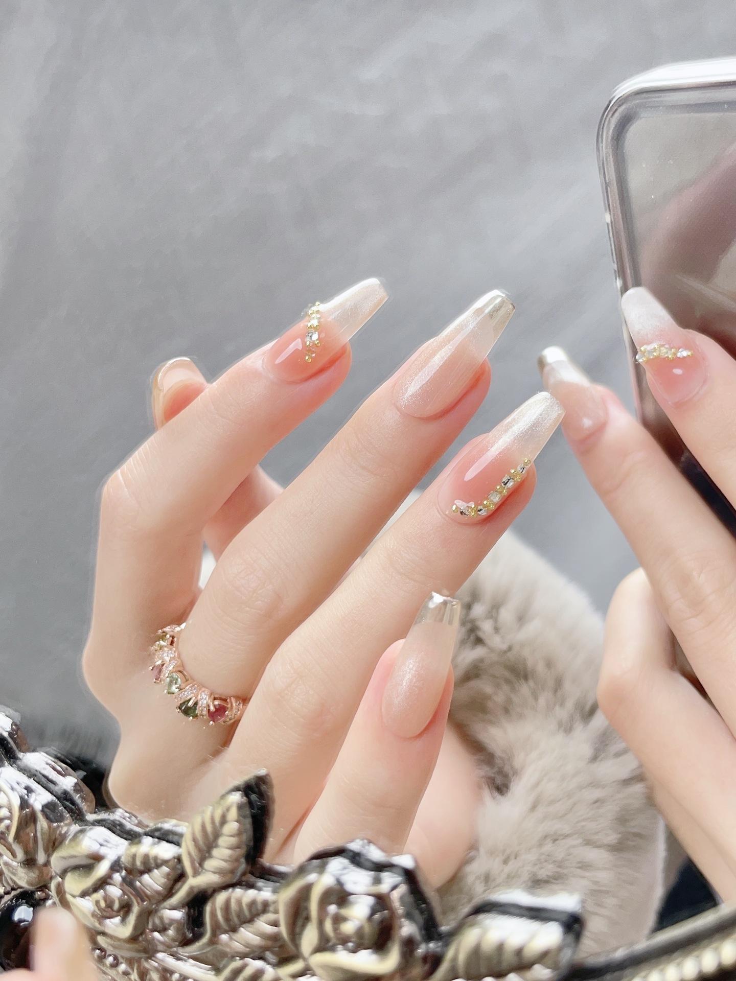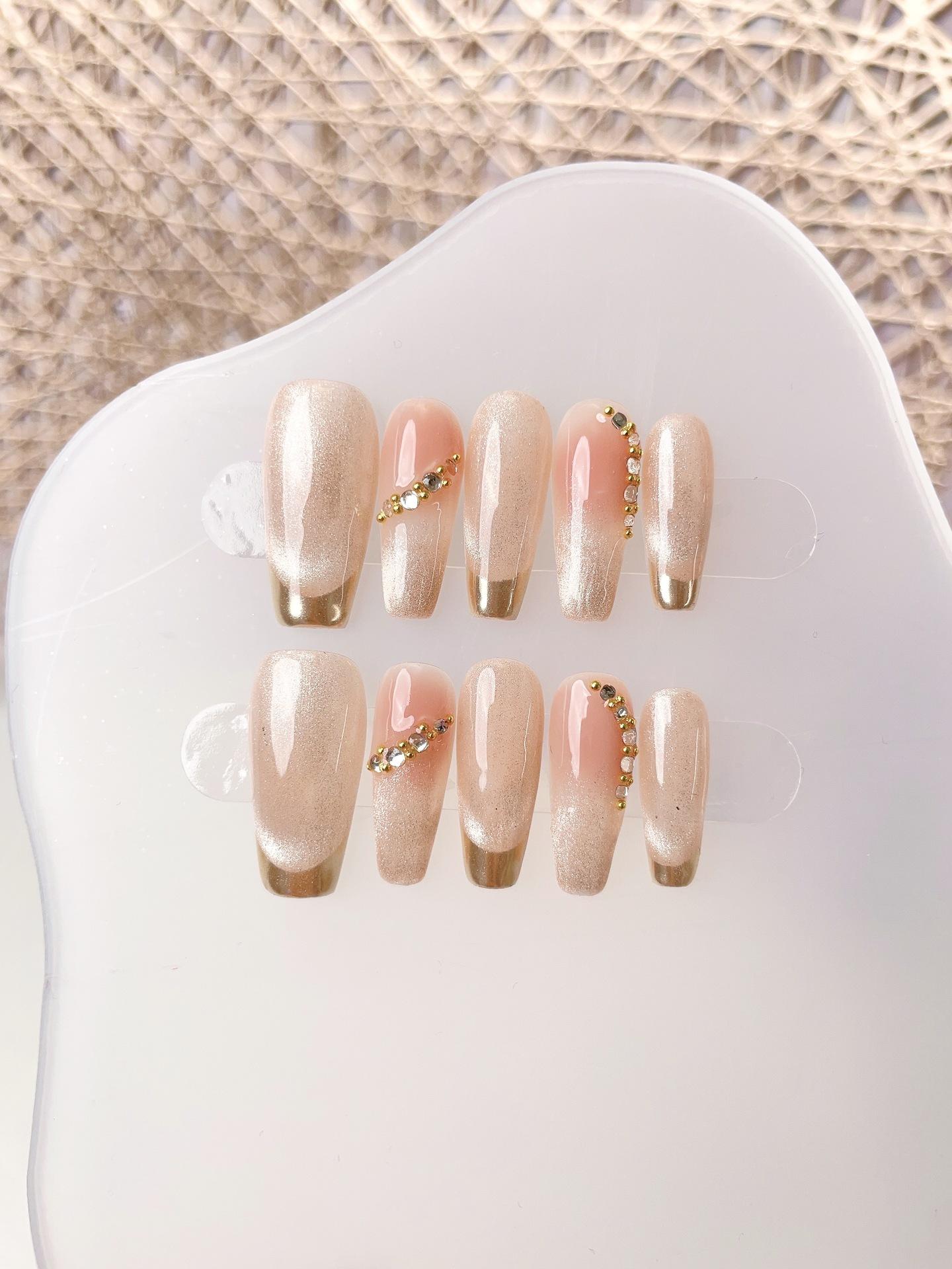Manicura Portátil Puramente Hecha a Mano, Manicura de Fototerapia, Ojo de Gato Brillante, Festival Suave, Uñas Postizas Maillard Pintadas a Mano Otoño Hielo Transparente