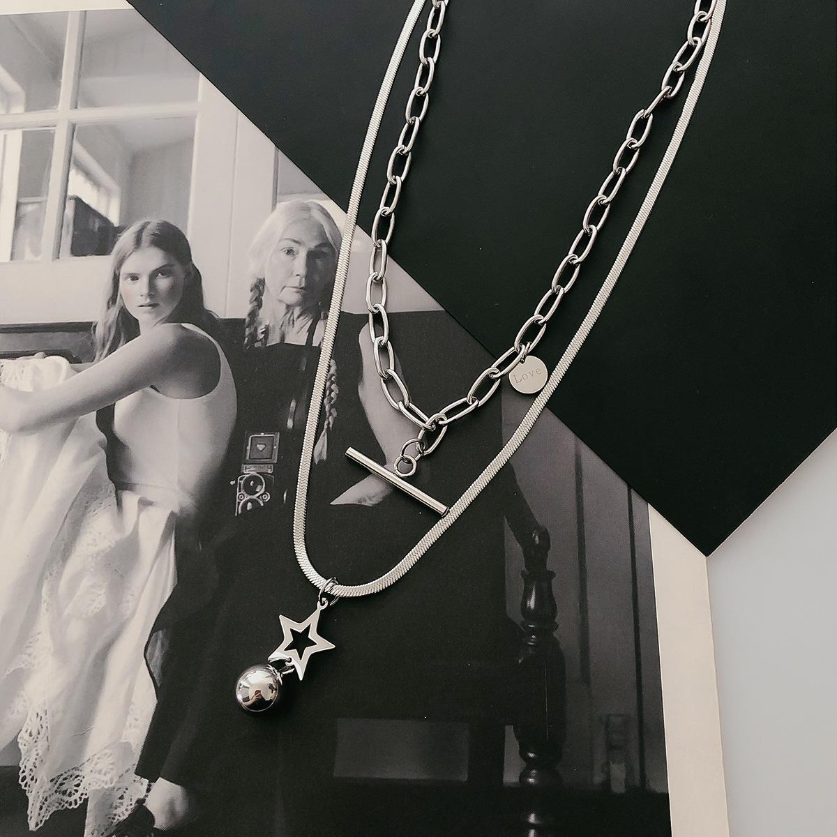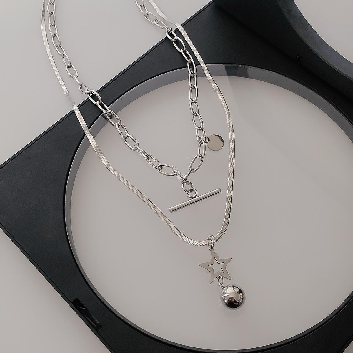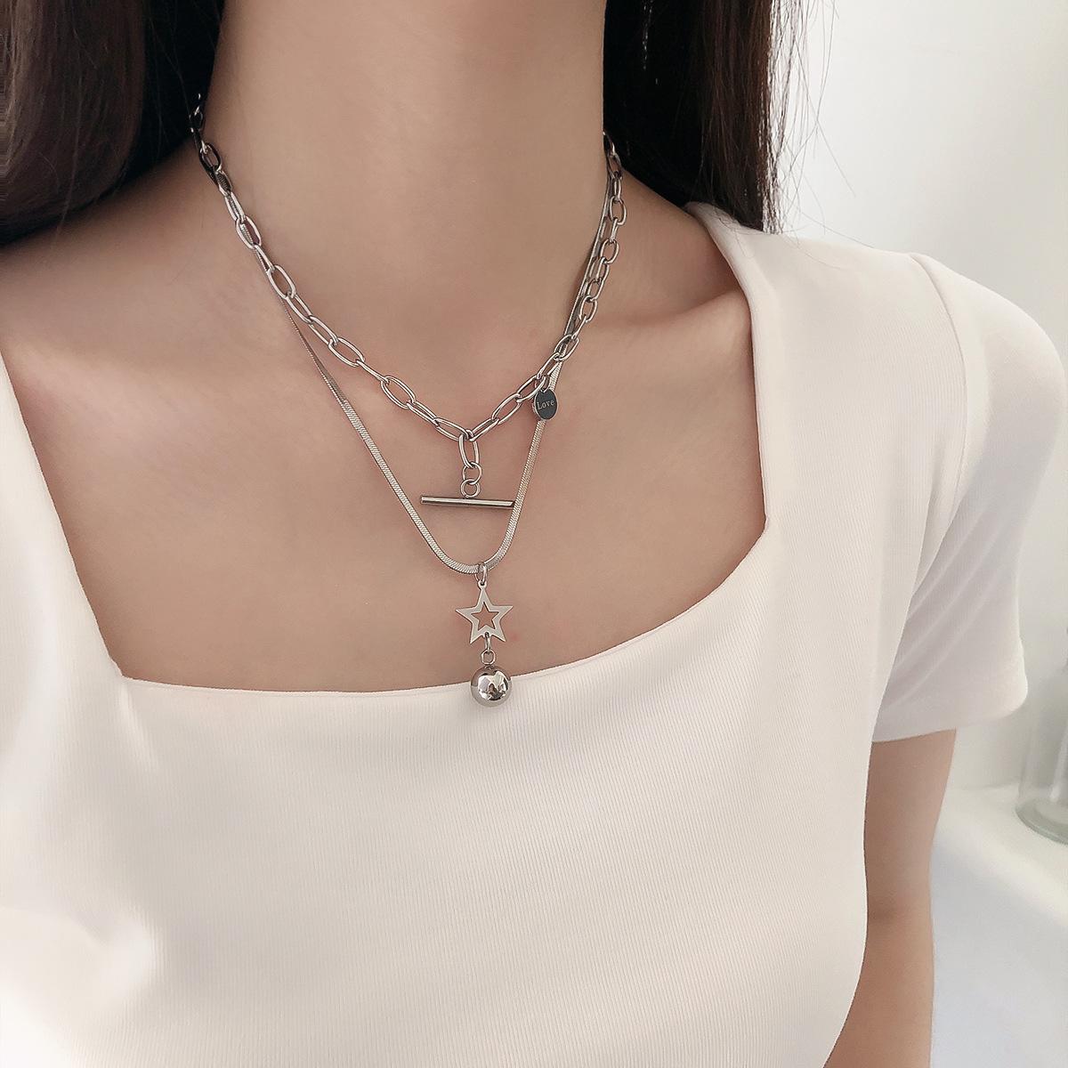 Collar de doble capa de acero de titanio para mujer, combinable con todo, estilo frío, diseño de nicho, cadena de hueso de serpiente, collar moderno con bola de metal y estrella.