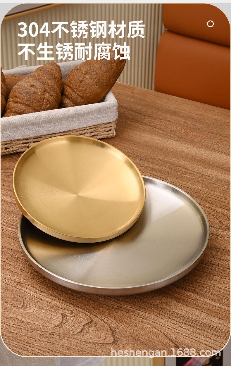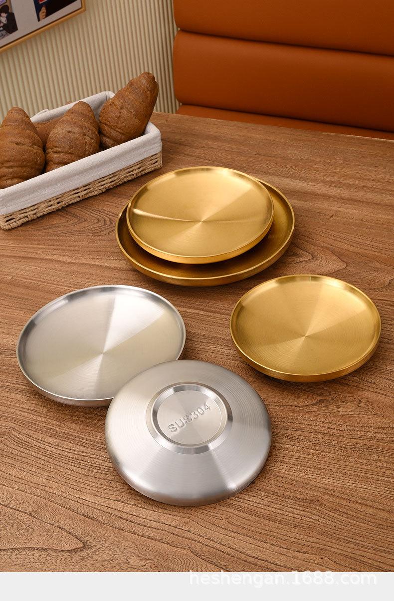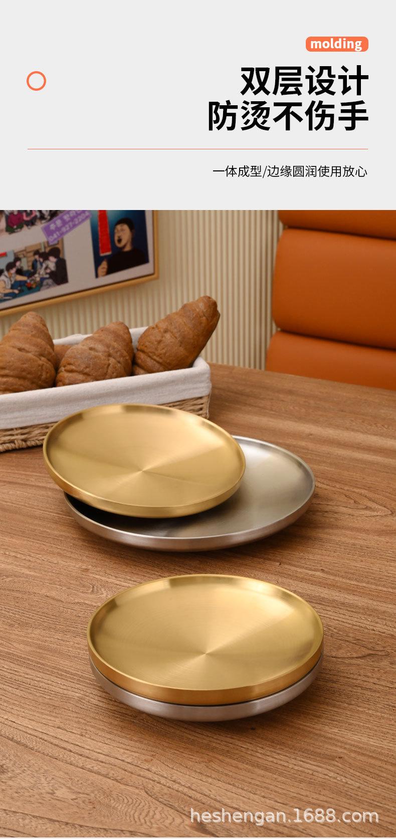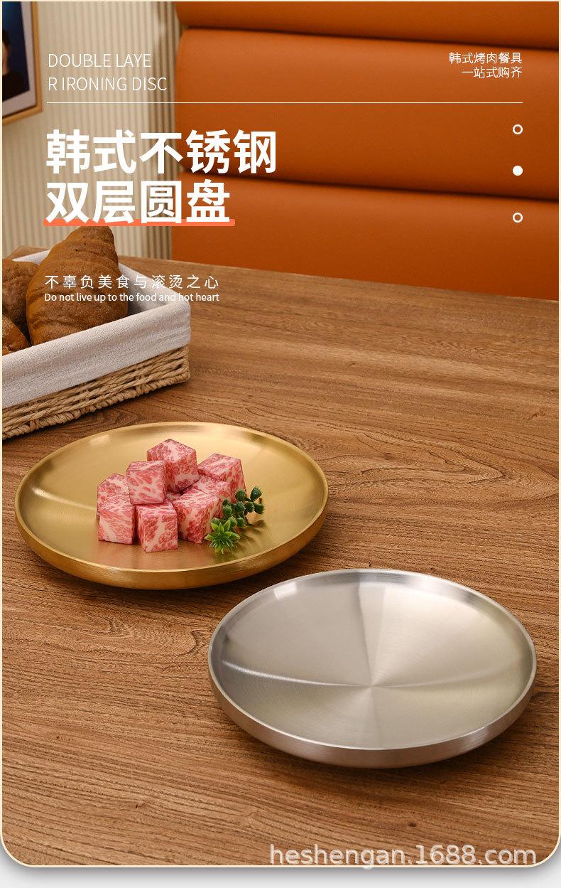 Plato de barbacoa dorado comercial de doble capa de acero inoxidable 304 coreano, plato plano aislado, plato de fruta