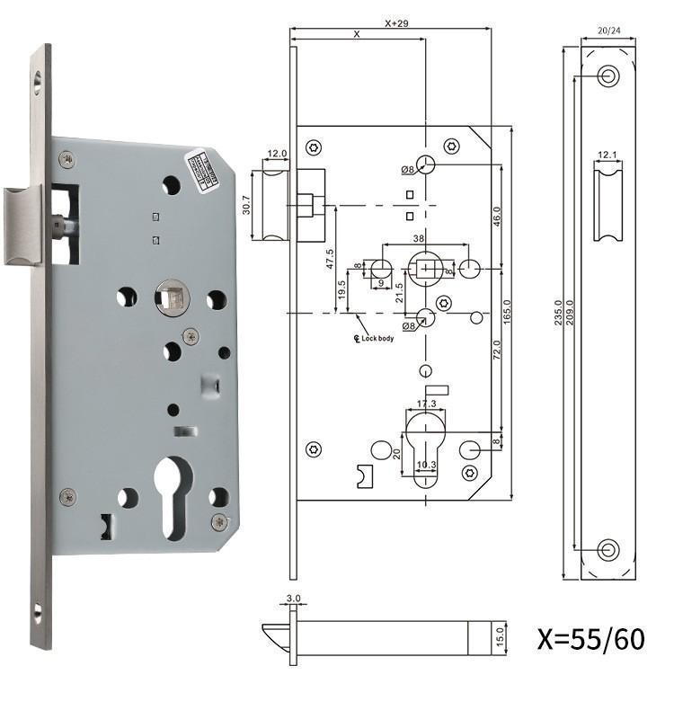 3. Especificaciones del cuerpo de la cerradura: 55*72/60*72; tamaño del panel: 235*24mm/235*20mm