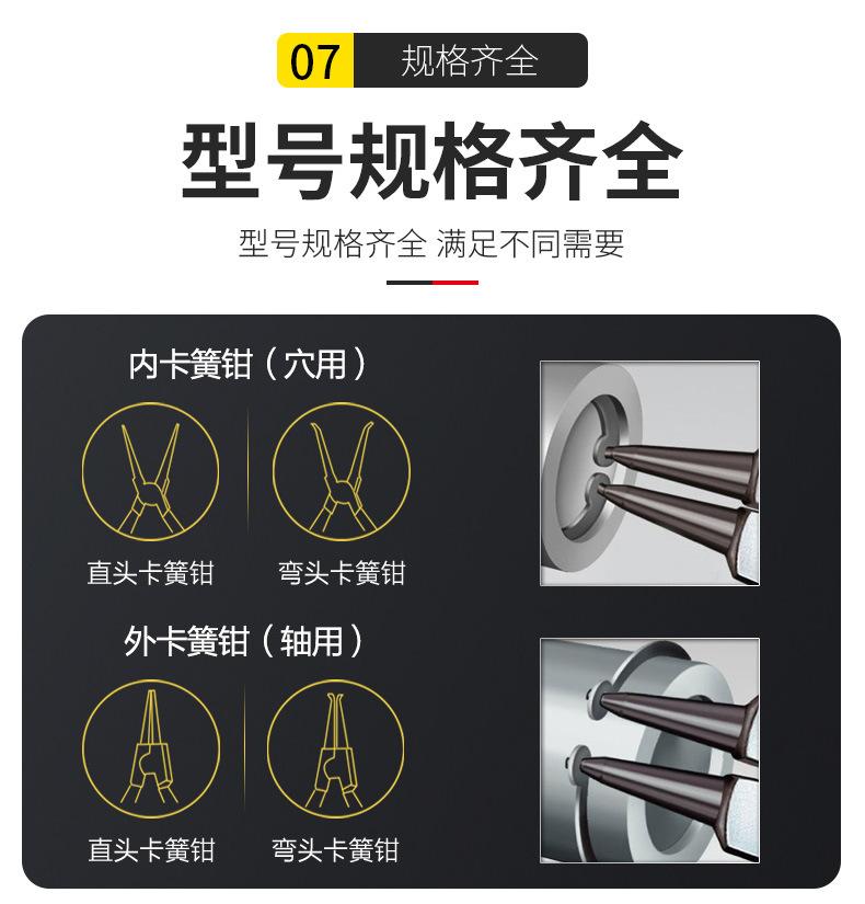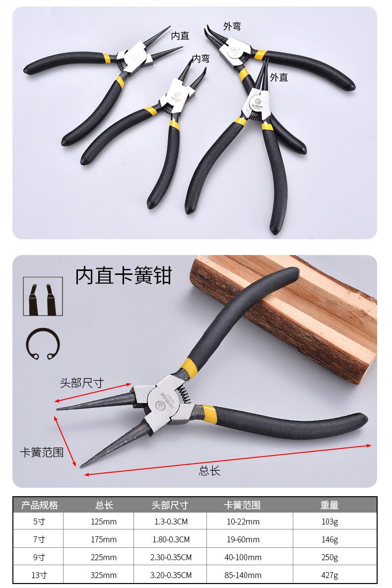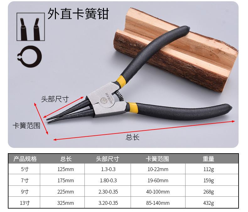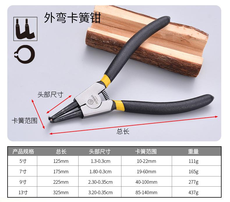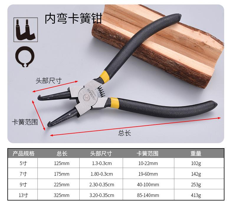 Estimado: Este es un enlace a unos alicates para anillos de seguridad: hay internos curvos, externos curvos, internos rectos y externos rectos. Las especificaciones son 5 pulgadas, 7 pulgadas, 9 pulgadas y 13 pulgadas. También hay un juego de alicates para anillos de seguridad de 7 pulgadas y 4 piezas, 13 pulgadas. Juego de cuatro piezas de alicates para anillos de seguridad, puede elegir las especificaciones según sus necesidades. Si tiene alguna pregunta, póngase en contacto con el servicio de atención al cliente.