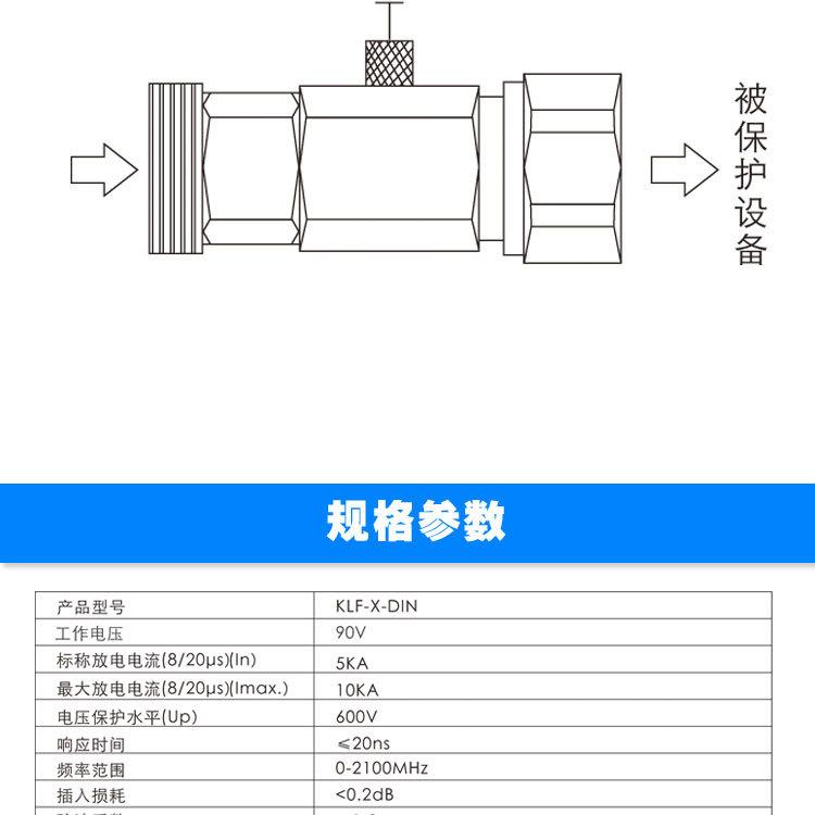 Protector contra sobretensiones de RF: KLF-X-DIN Esta serie de protectores contra sobretensiones es adecuada para la protección contra sobretensiones de varios sistemas de recepción y transmisión de señales de radiofrecuencia.