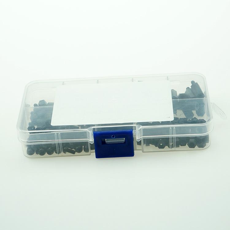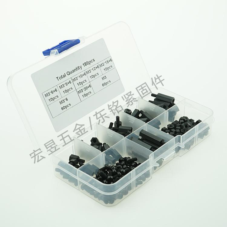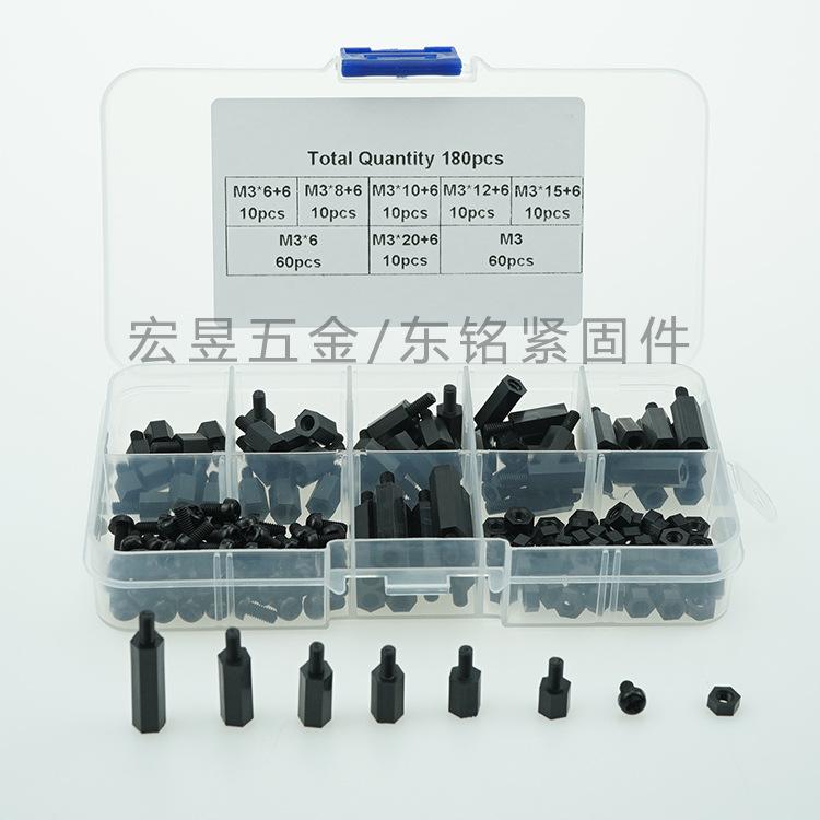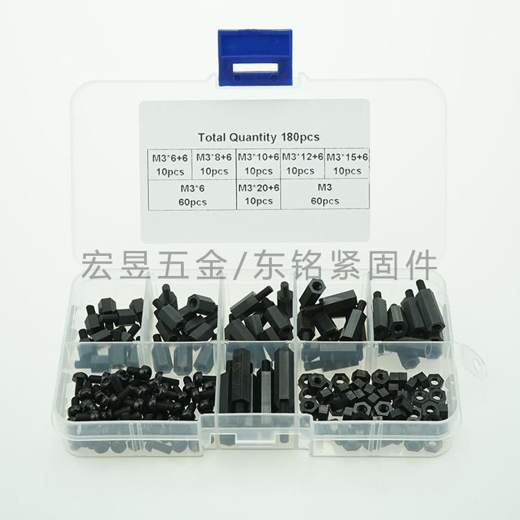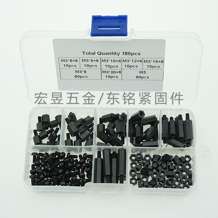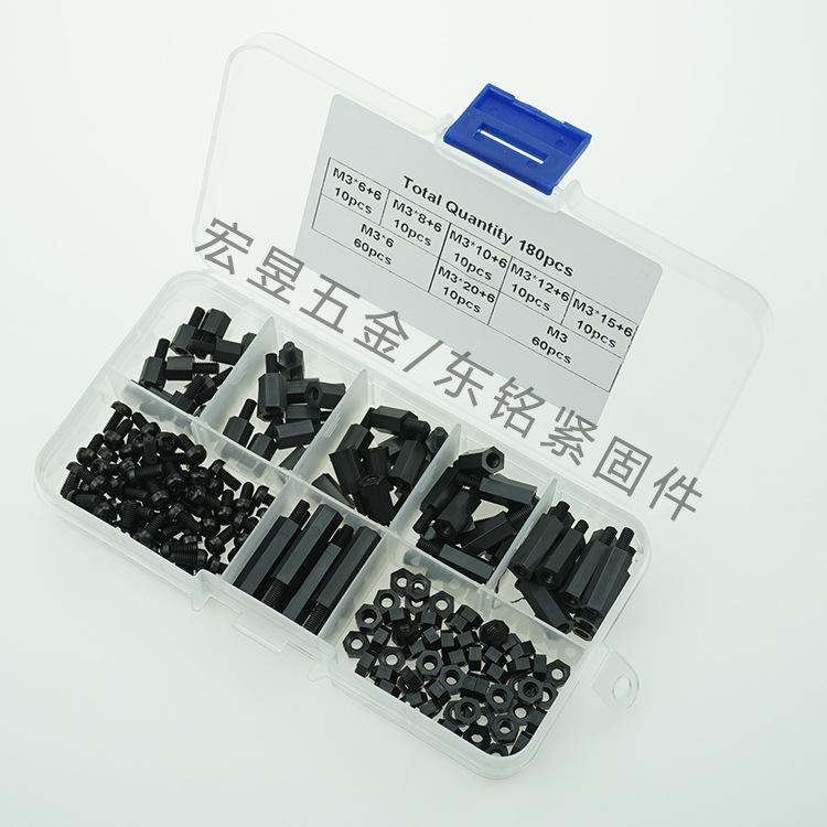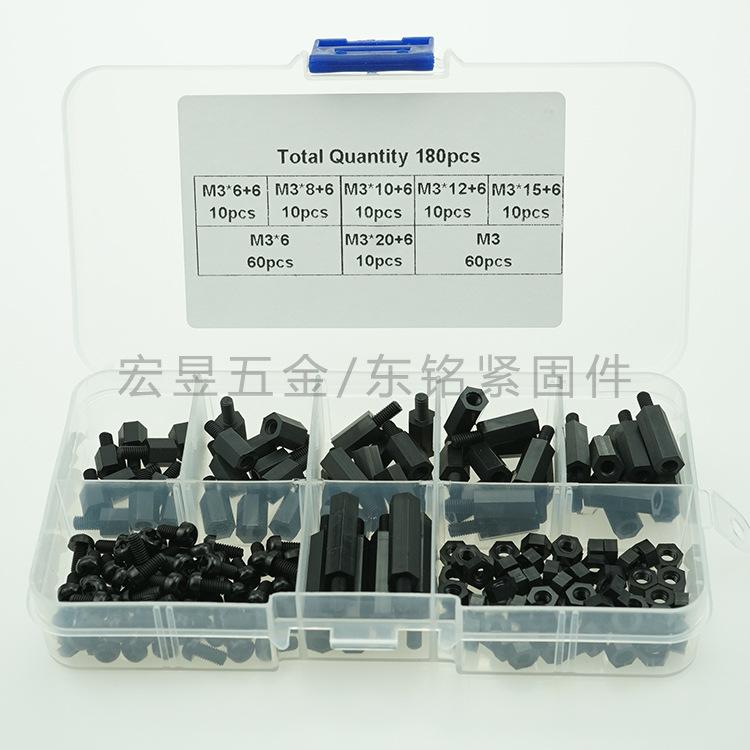 Suministro de juego combinado de tornillos de nailon M3 negros, tuerca de tornillo de nailon, columna de aislamiento, 180 piezas en caja