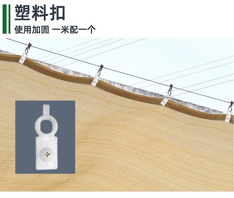 Las 4 esquinas están cosidas con anillos en D de acero inoxidable 304, que son más sólidos, resistentes al viento y duraderos. El resto de los lugares están equipados con hebillas libres cada metro según el tamaño, que son flexibles para la instalación y el uso. Los sujetadores están hechos de nailon y tienen una vida útil de 6-8 años.
