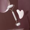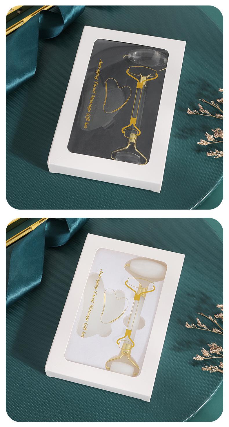 Amazon Venta Caliente Polvo Cristal Jade Rodillo Masajeador Doble Cabeza Forma de Corazón Facial Ojo Masaje Raspado Traje Combinado