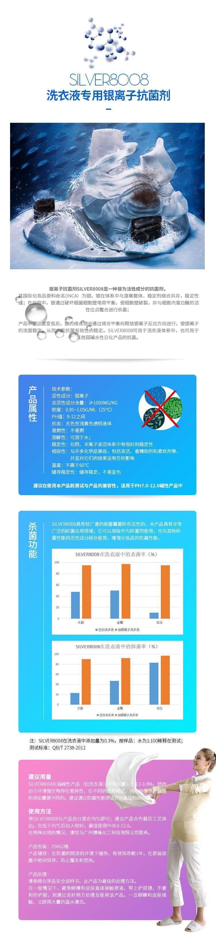 El agente antibacteriano de iones de plata para detergente para ropa es adecuado para productos alcalinos con un valor de pH de 7-12 y tiene buena compatibilidad.