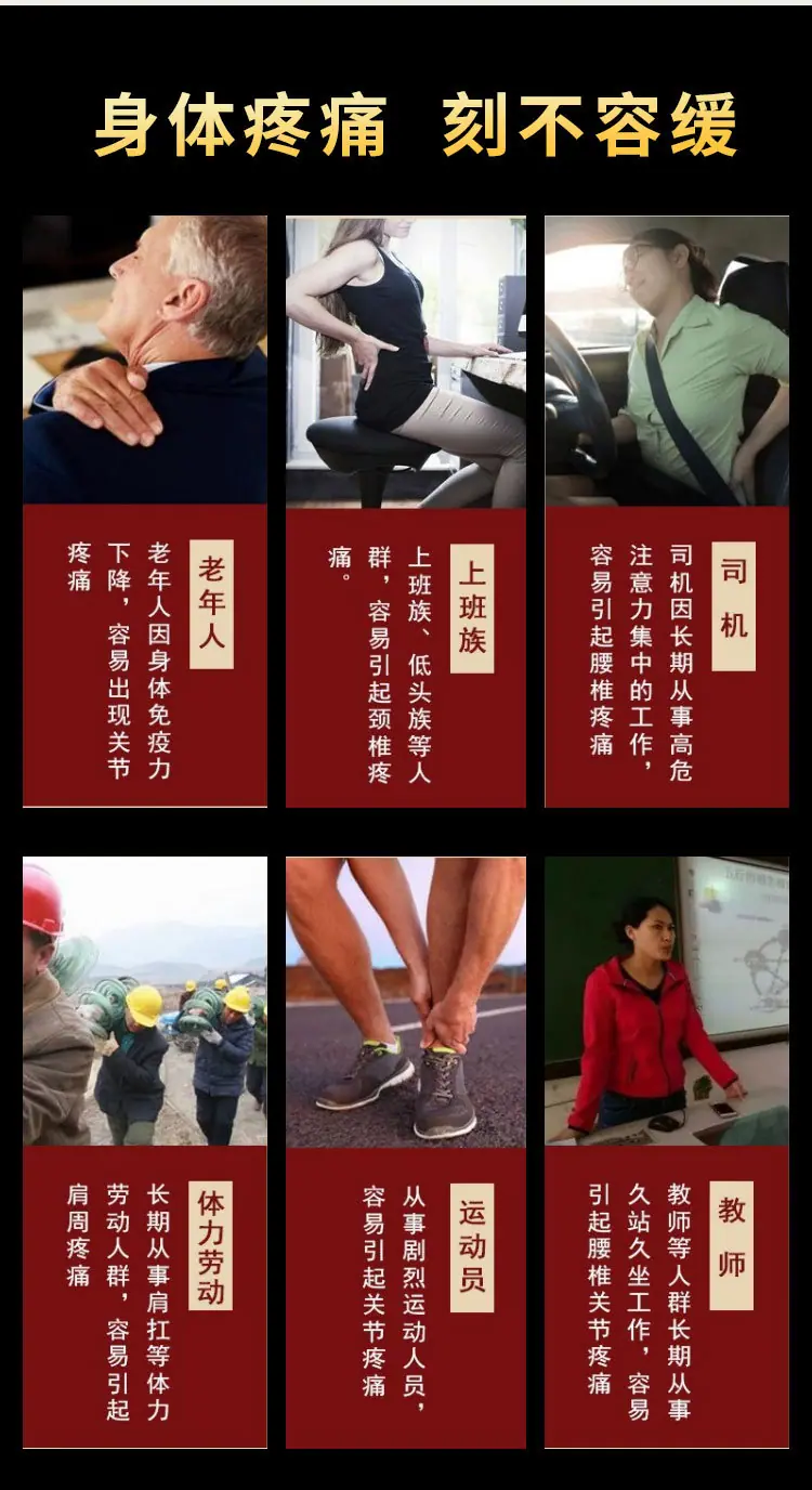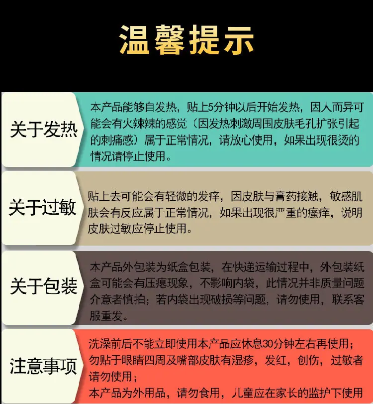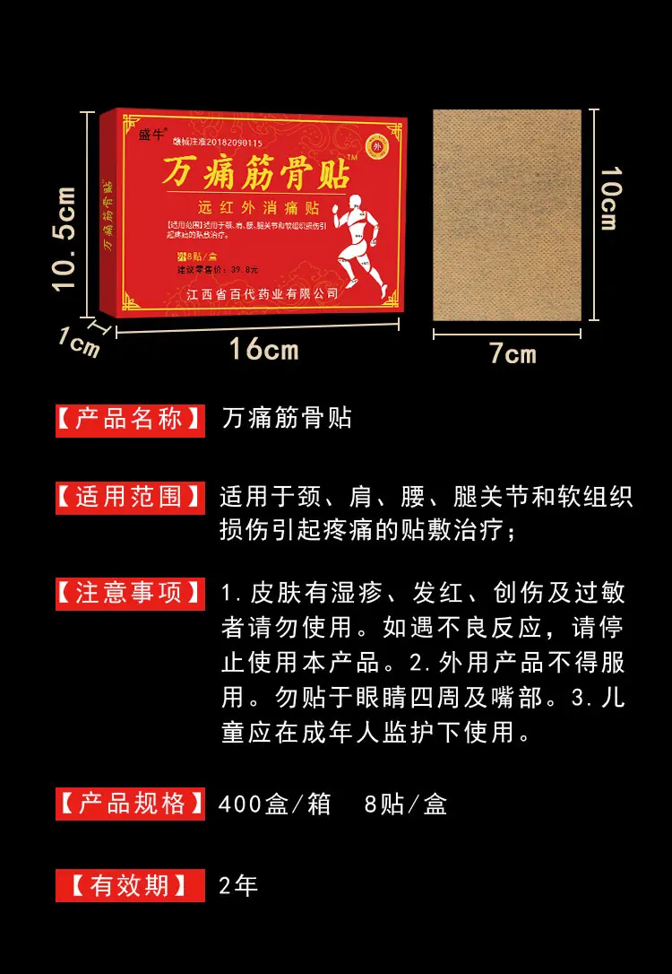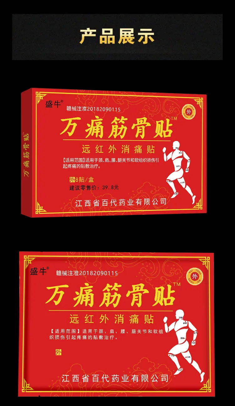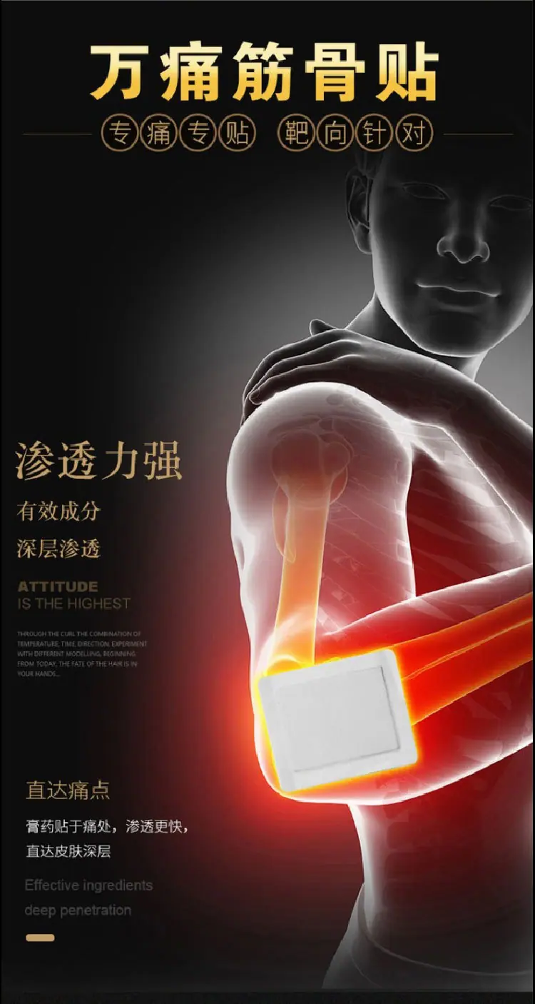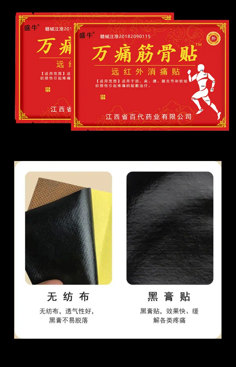 It is suitable for sticking treatment of pain caused by neck, shoulder, waist, leg joint and soft tissue injury.