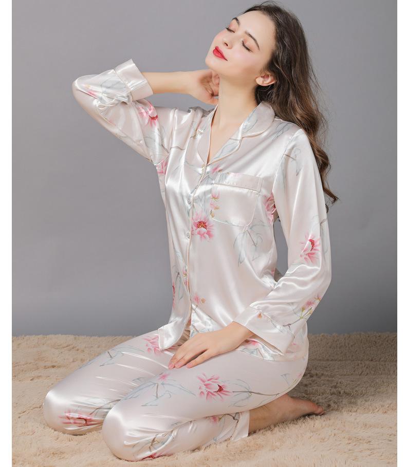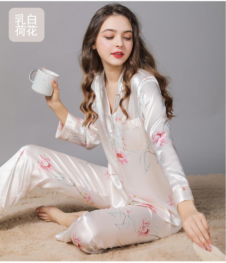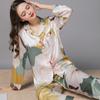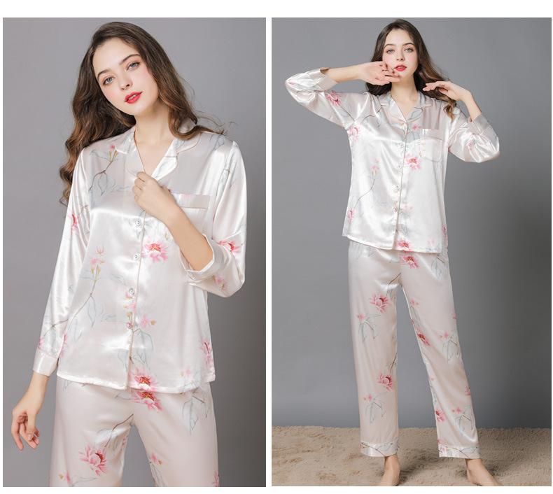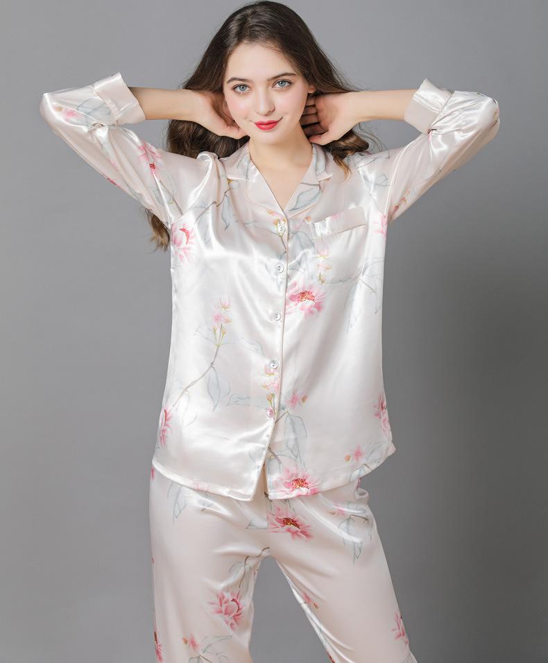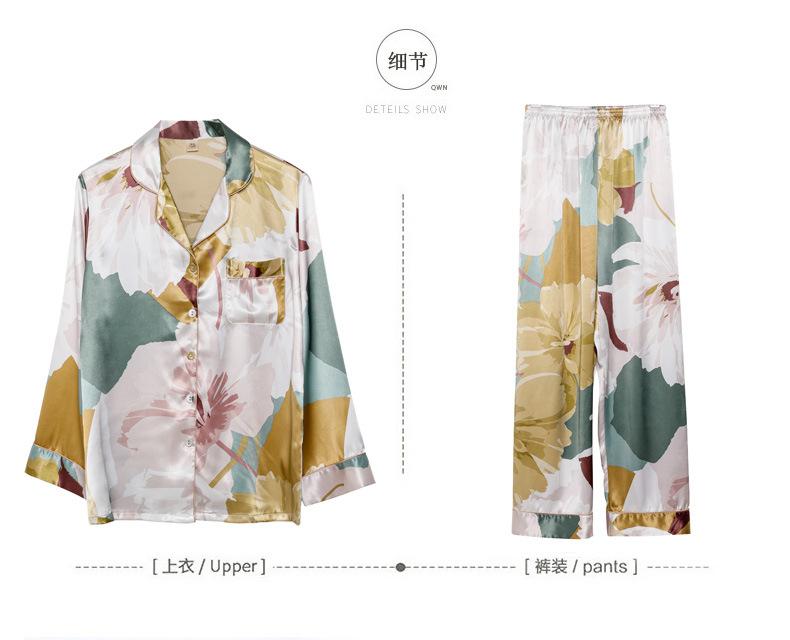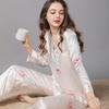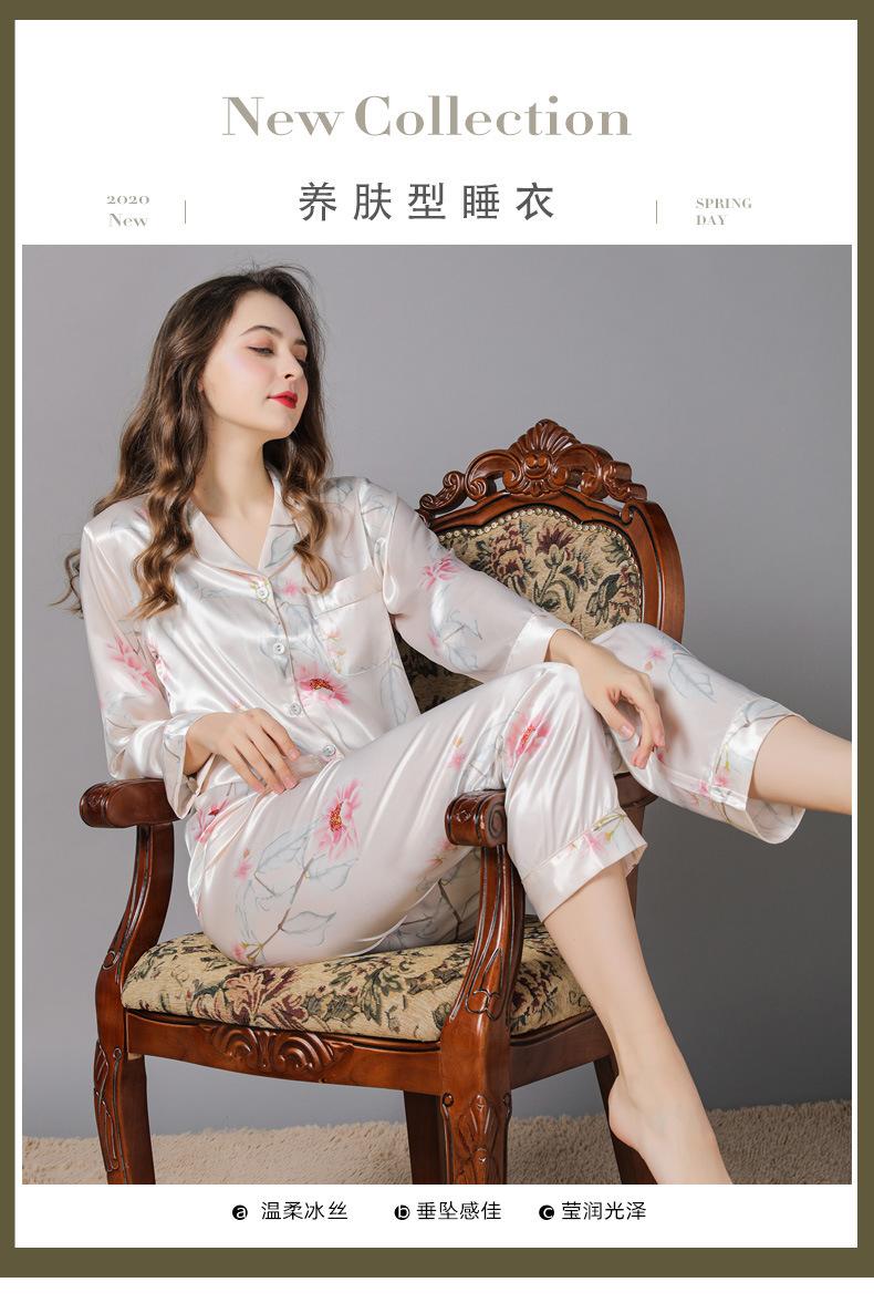 Pijama de seda de verano para mujer, traje de seda de hielo estampado de manga larga, cárdigan de seda de primavera, ropa informal fina para el hogar