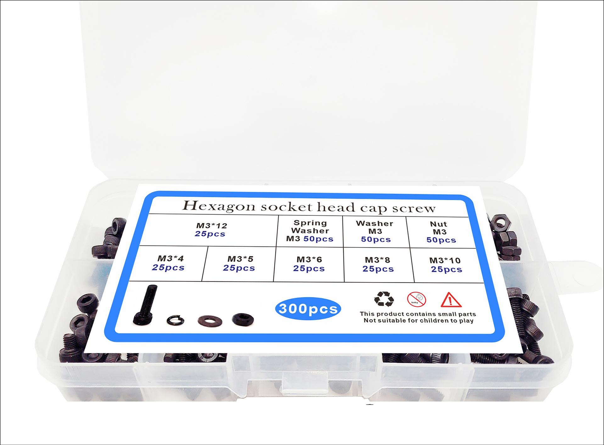300 piezas Juego de tornillo de cabeza cilíndrica de cabeza de copa negra, tuerca, arandela plana, arandela de resorte, caja M3, tornillo de cabeza hueca hexagonal