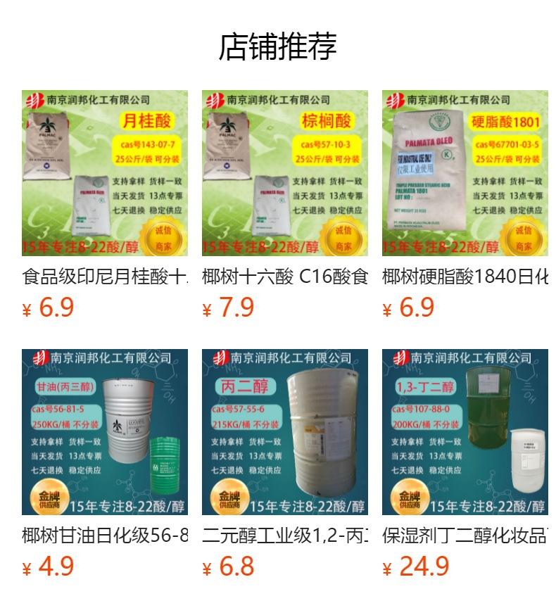 Uso: Utilizado principalmente como materia prima para la producción de tensioactivos, utilizado para producir ésteres de ácidos grasos de sorbitán, ésteres de ácidos grasos de glicerina, ésteres de ácidos grasos de etilenglicol o propilenglicol, etc. También se puede utilizar para producir miristato de isopropilo, etc. También utilizado como agente antiespumante y aromatizante. Según las regulaciones GB2760-89 de mi país, se puede utilizar para preparar diversas especias comestibles.