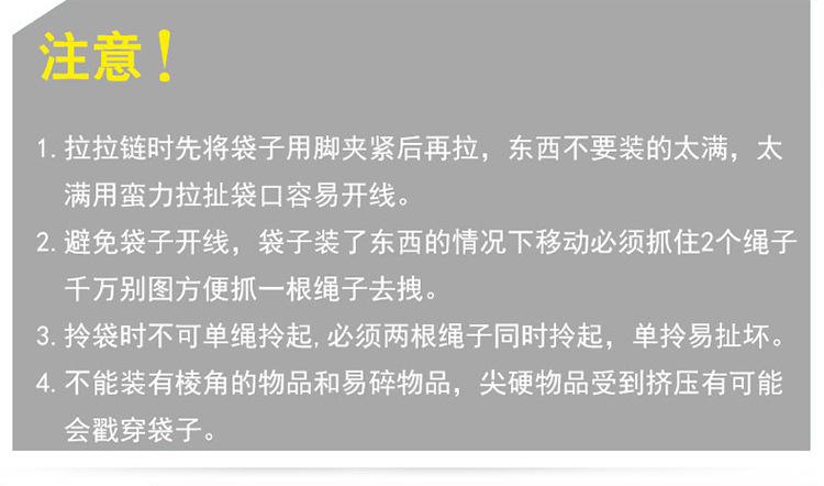 1. No abra la cremallera después de llenarla demasiado. Debe sujetar la bolsa con los pies antes de abrirla. Se recomienda llenarla solo al 80 %.