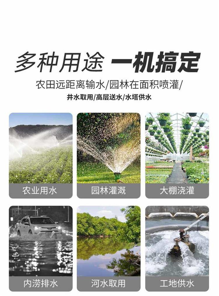 3. Gran caudal. El caudal de 10 cm de diámetro de la serie de gran caudal puede alcanzar los 60 metros cúbicos por hora. Esta bomba de agua con motor de gasolina de cuatro tiempos se caracteriza por su bajo nivel de ruido, bajo consumo de combustible, alta elevación, gran caudal, fácil de accionar, gran potencia, gran estabilidad y ausencia de tracción en los cilindros.