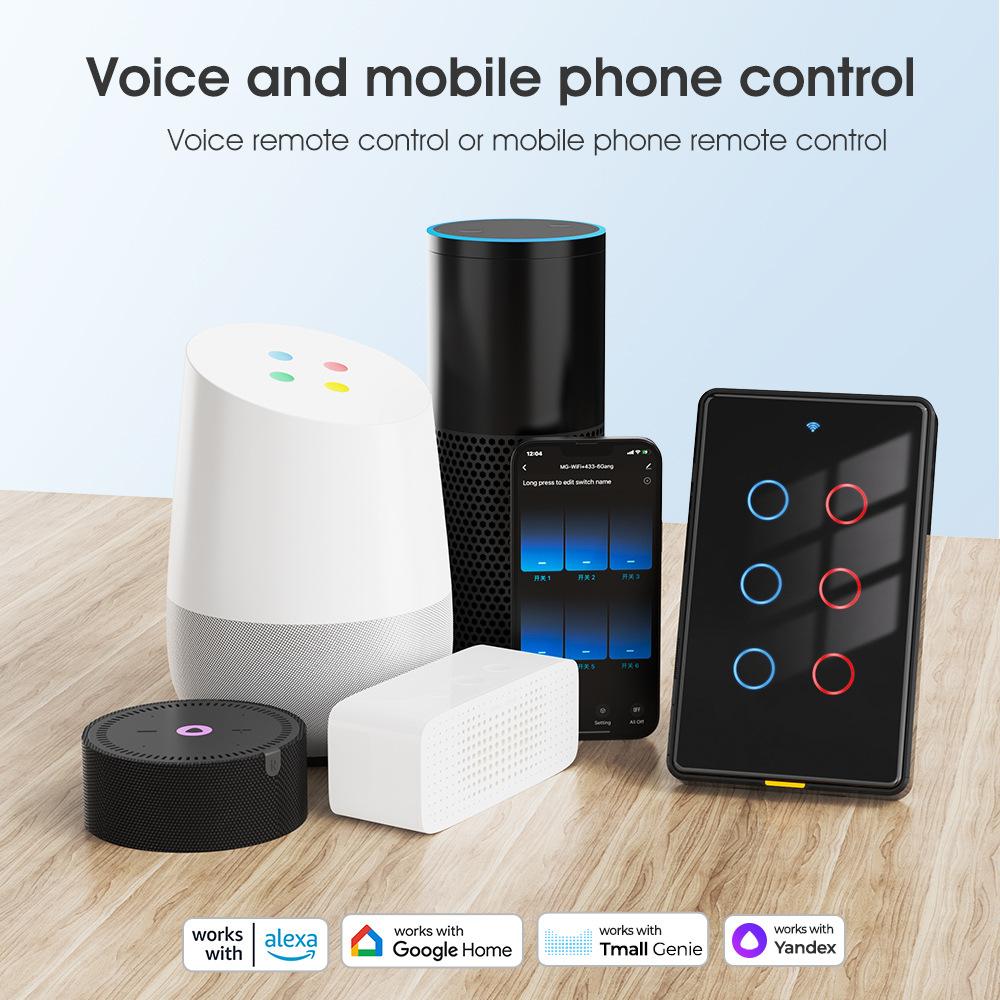 Tras conectarte a la puerta de enlace inteligente, puedes controlar fácilmente nuestros interruptores inteligentes por voz a través de Tmall Genie, Alexa y Google Home Assistant. Conéctate a la app Tuya en tu móvil y configúrala fácilmente para empezar tu aventura en el hogar inteligente, disfrutar de una vida inteligente y tener las manos libres.