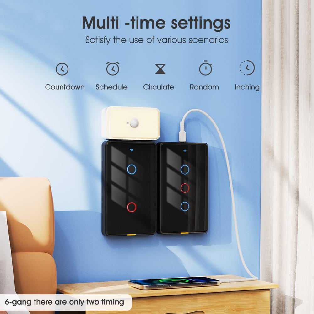 La temporización se puede configurar según los hábitos personales para controlar automáticamente el interruptor, incluyendo temporización, cuenta regresiva, temporización de ciclos, temporización aleatoria y temporización de avance lento. Esto nos ayuda a usar los electrodomésticos de forma racional y a evitar el uso innecesario a largo plazo, prolongando así la vida útil del producto y ahorrando energía. (El modelo 6-on solo incluye temporización y cuenta regresiva).