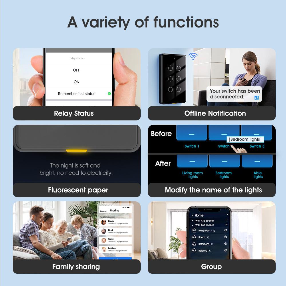 Además de voz y teléfono móvil, nuestros interruptores también son compatibles con el control remoto RF433, con una distancia de detección ultralarga de 100 metros sin obstáculos. Disponemos de una variedad de métodos de control para que usted elija.