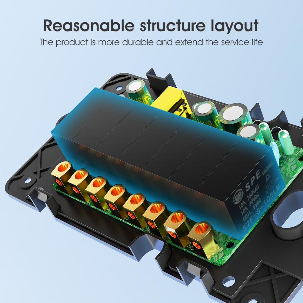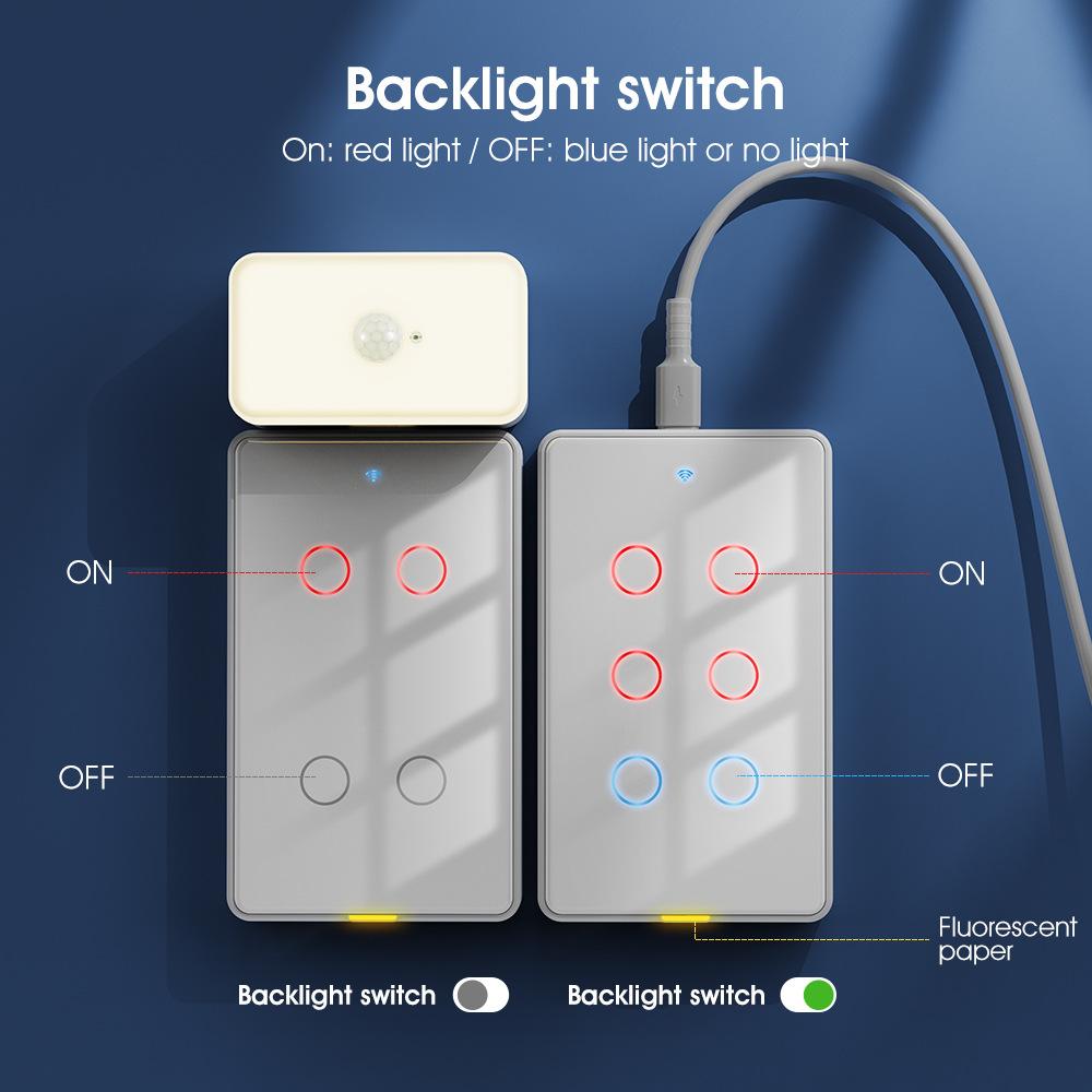 La luz indicadora del interruptor utiliza luces rojas y azules para identificar su estado. La retroiluminación se puede apagar por la noche a través de la aplicación. No hay de qué preocuparse. La parte inferior del interruptor está cuidadosamente equipada con una tira fluorescente que emite un leve recordatorio para que pueda encontrar fácilmente la posición del interruptor por la noche. Además, el brillo de la tira de luz es moderado y no afectará su sueño.