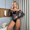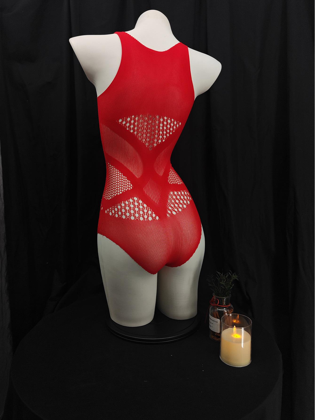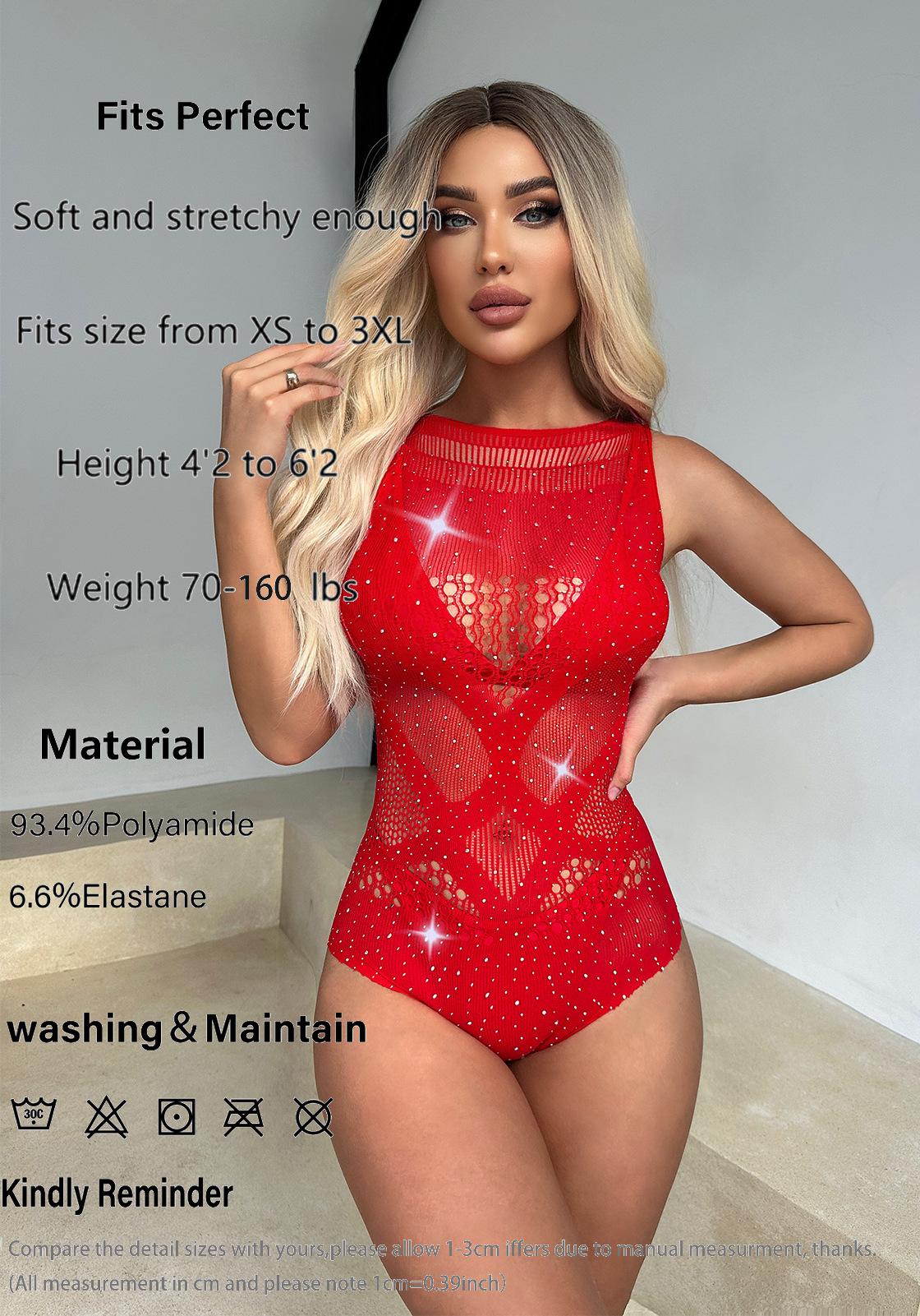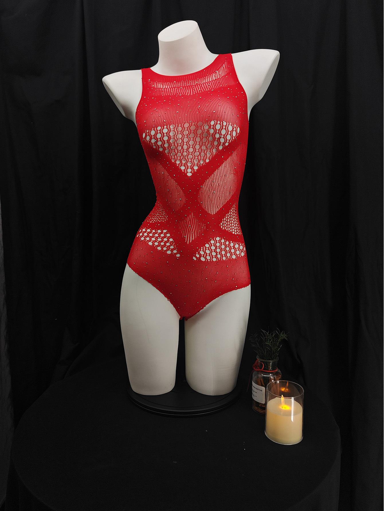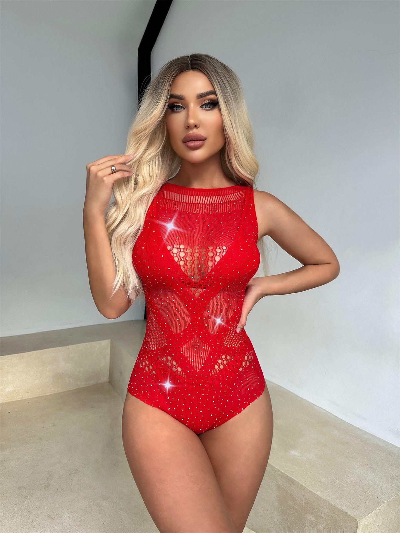 Bikini rojo con diamantes de imitación huecos, sexy, europeo y americano, con red de pesca y perforación en caliente, ropa interior sexy para mujer, sin diamantes brillantes, ropa de malla ajustada.