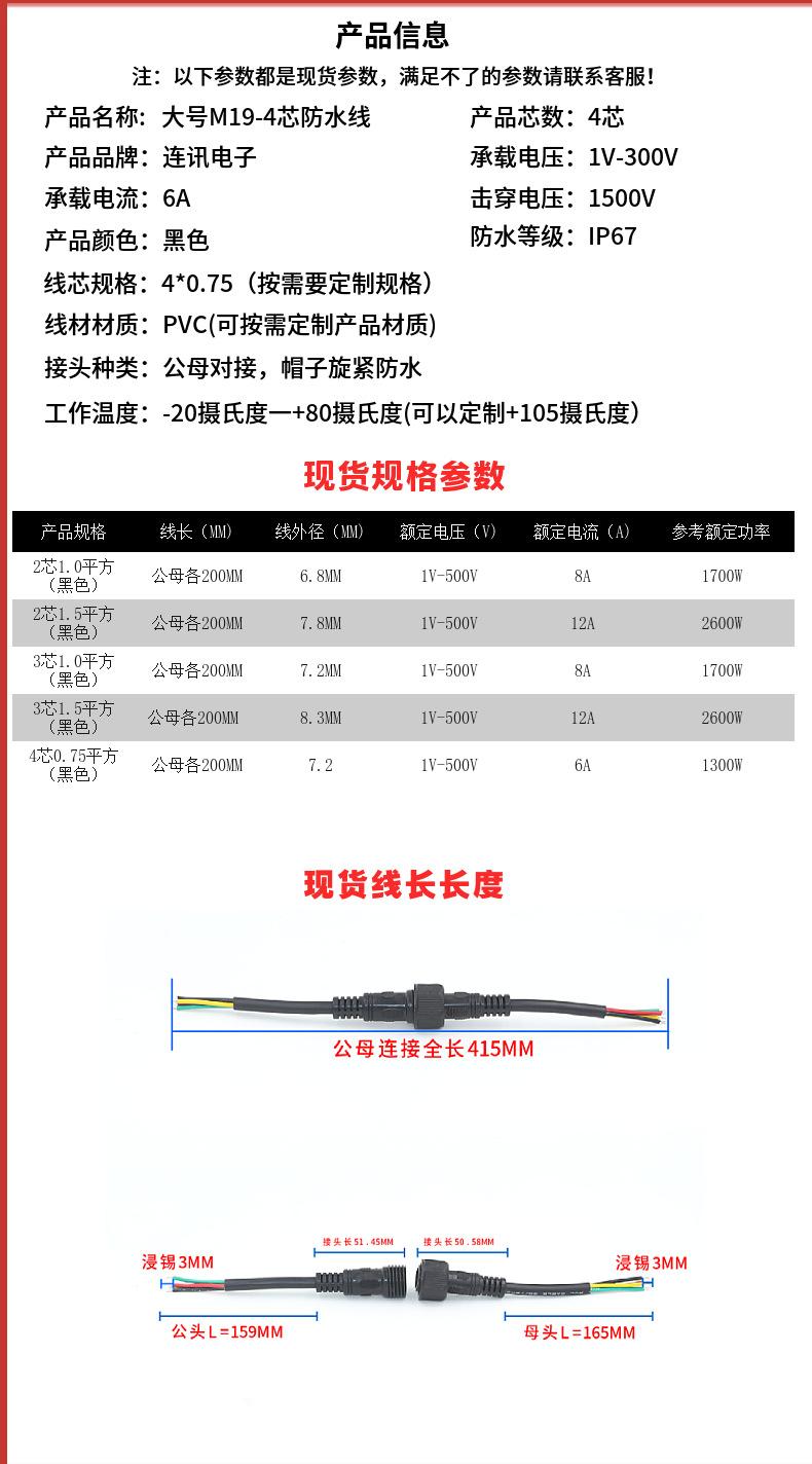 Conector M19 Cable de Conexión de 4 Núcleos 0.75 Cuadrados Cable de Señal de Alimentación de Equipo Conector Macho-Hembra Led Especial