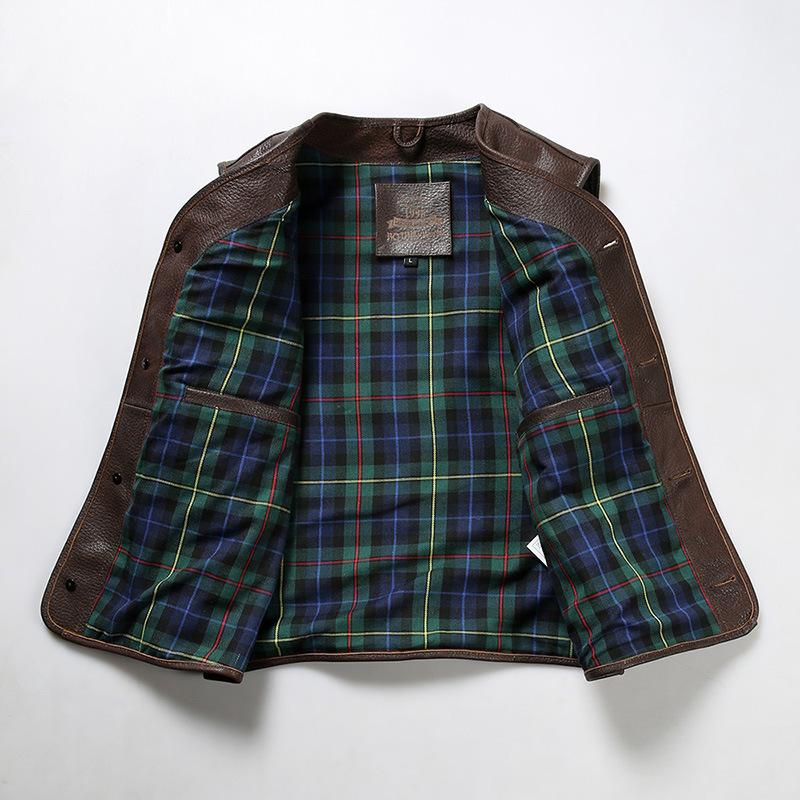 Chaleco casual de cuero de verano, Hecho de cuero vacuno marrón, con un grosor de 0.8 mm y textura lichi. Forro de algodón a cuadros. Botón de claxon, Estilo corto con escote corazón, S-3XL, adecuado para amigos que pesan 90-180 libras.