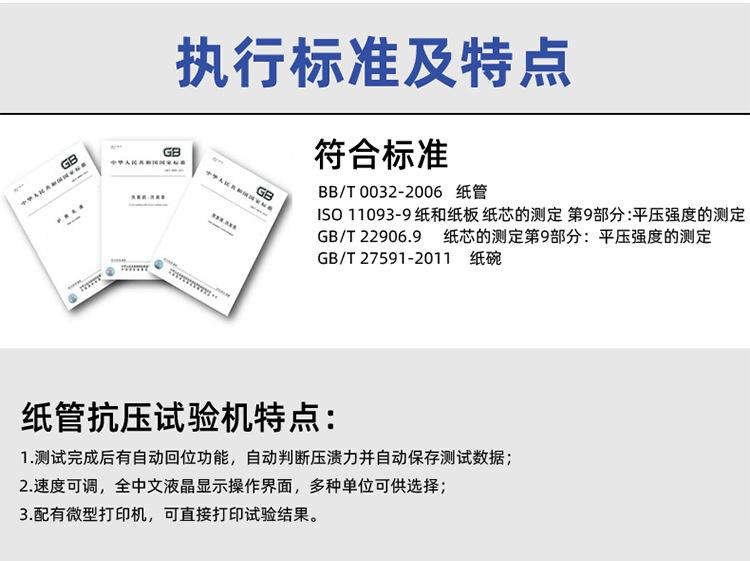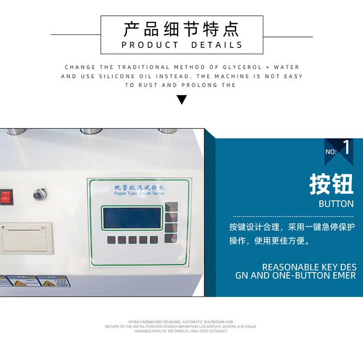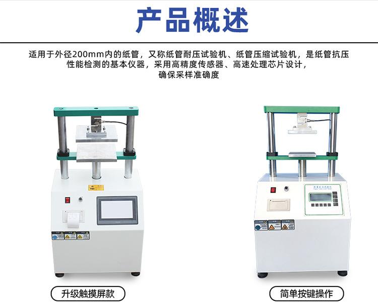 La máquina de prueba de compresión de tubos de papel es adecuada para tubos de papel con un diámetro exterior de 200 mm. También se le llama máquina de prueba de presión de tubos de papel y máquina de prueba de compresión de tubos de papel. Es un instrumento básico para probar el rendimiento a la compresión de tubos de papel. Utiliza sensores de alta precisión y chips de procesamiento de alta velocidad. Diseñado para garantizar la precisión del muestreo.