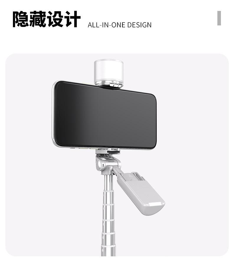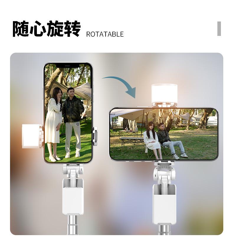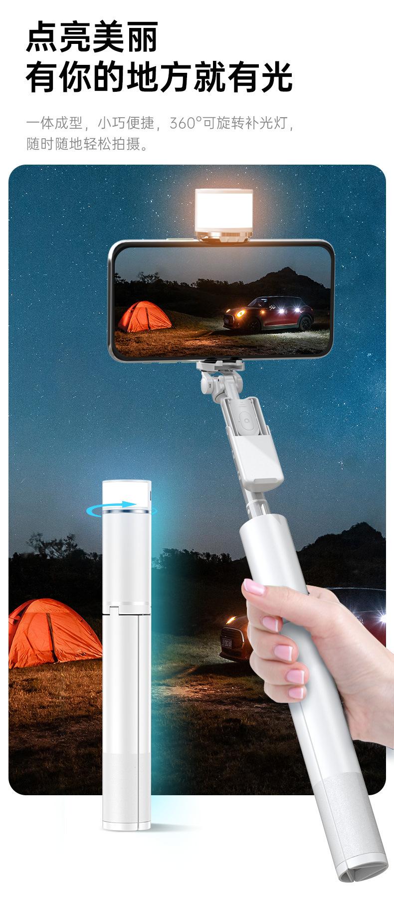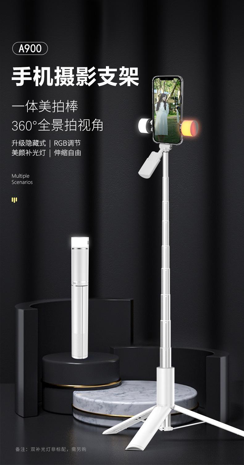 Nuevo palo de selfie con Bluetooth, venta al por mayor, luz de relleno en vivo, trípode integrado para escritorio, soporte para disparo de teléfono móvil