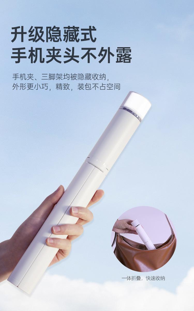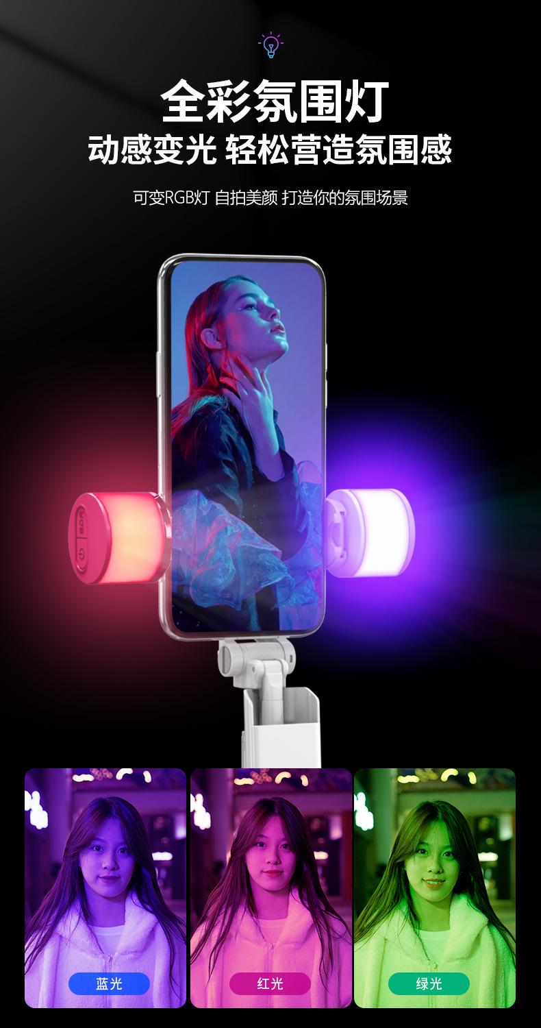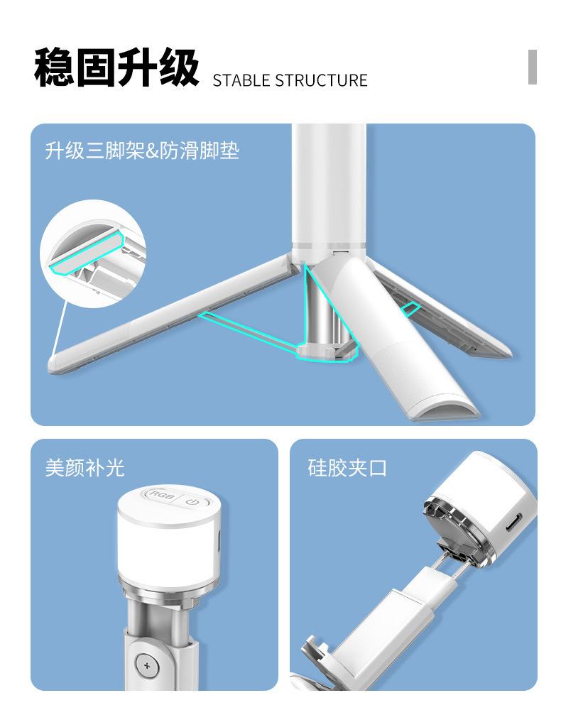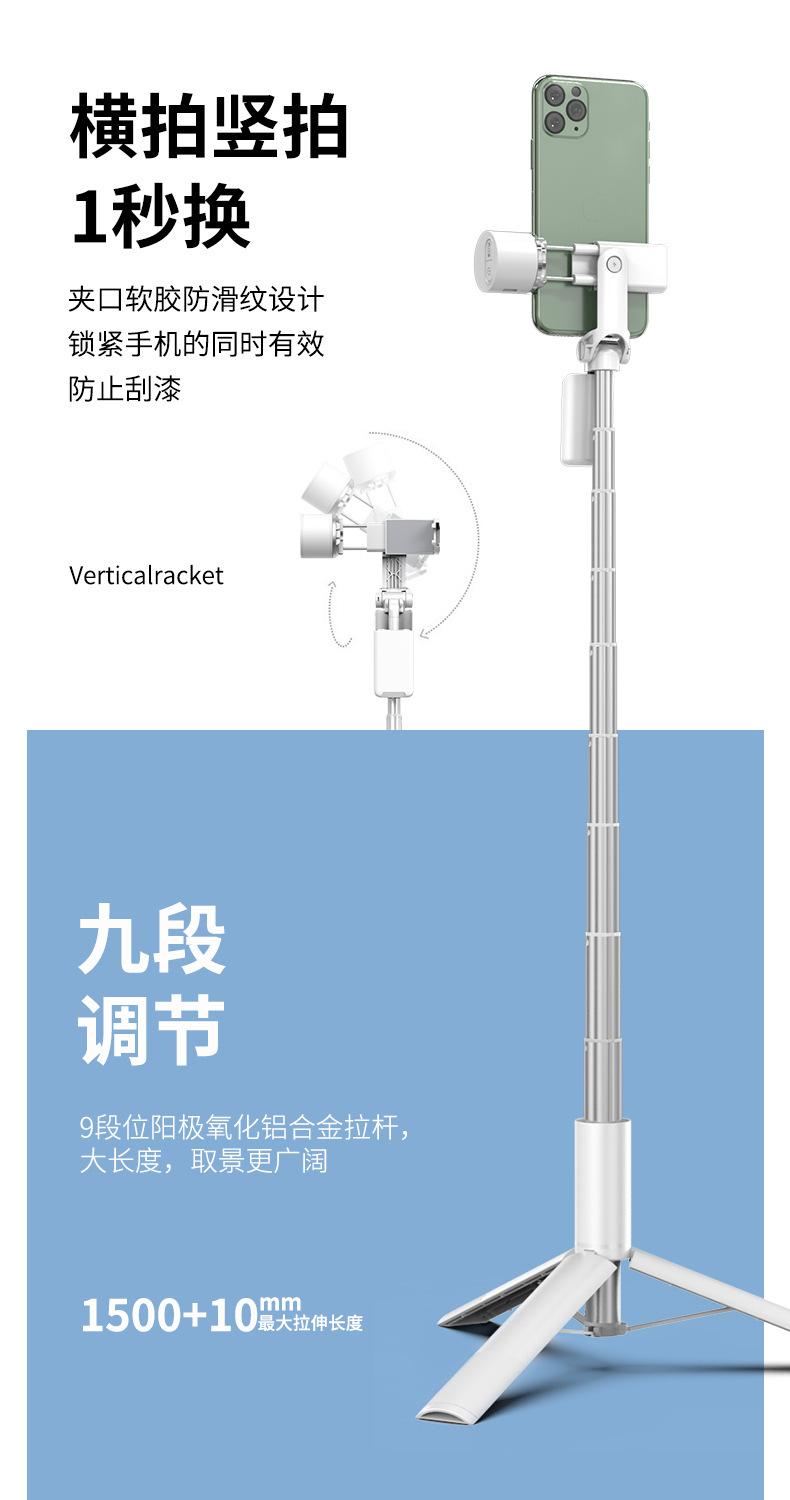 Nuevo palo de selfie con Bluetooth, venta al por mayor, luz de relleno en vivo, trípode integrado para escritorio, soporte para disparo de teléfono móvil